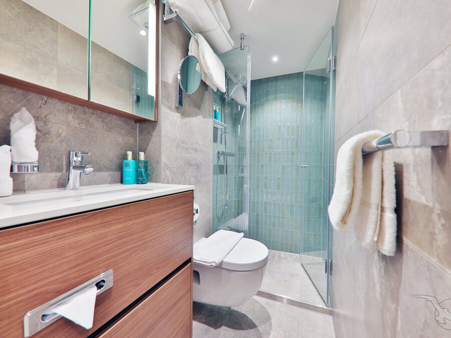 Ausstattung: Dusche/WC, Fön, individuell regulierbare Klimaanlage, SAT-TV (Flachbildschirm), Radio, Minibar, Kaffeemaschine, Safe, Telefon, Bordspannung 230 V Wechselstrom. Kabinengröße ca. 12,5 qm.