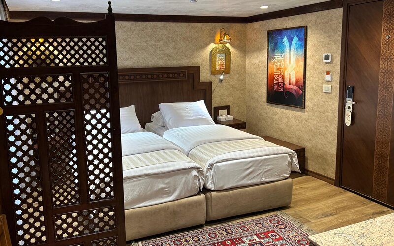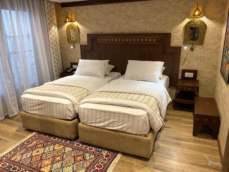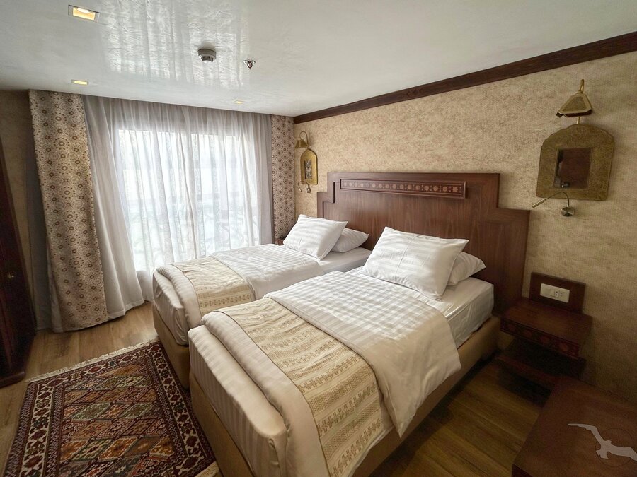 Die Kabinen liegen außen, im orientalischen Stil modern eingerichtet und verfügen über einen französischen Balkon sowie einen Außenbalkon mit Sitzgelegenheit. Ausstattung: Dusche/WC, Föhn, regulierbare Klimaanlage, SAT-TV, gefüllte Minibar (bei Verpflegung all inclusive light), Teekocher, Schiffstelefon und Privatsafe. Kabinengröße ca. 24 m².