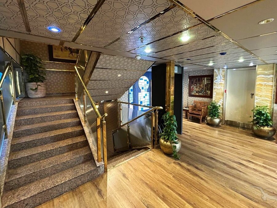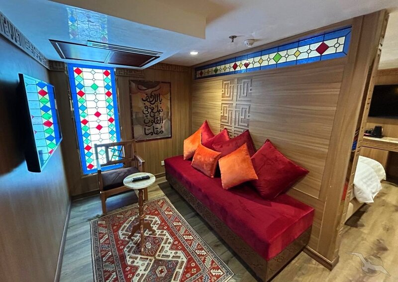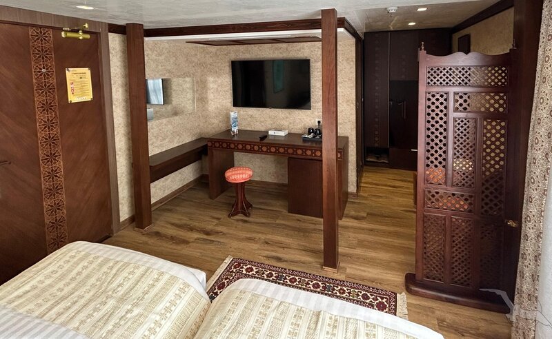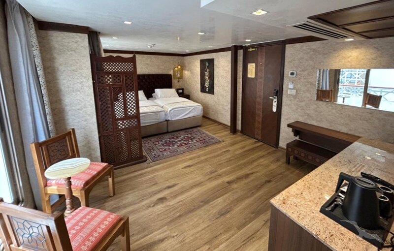 Die beiden Suiten liegen separat im vorderen Bereich des oberen Decks, sind im orientalischen Stil modern eingerichtet und verfügen über einen separaten Wohnbereich mit Sitzecke/Sofa, SAT-TV und einer privaten, kleinen Außenterrasse mit Schiebetür und Sitzgelegenheit. Ausstattung: Dusche/WC, Föhn, regulierbare Klimaanlage, gefüllte Minibar (bei Verpflegung all inclusive light), Teekocher, Schiffstelefon und Privatsafe. Kabinengröße ca. 28 m².