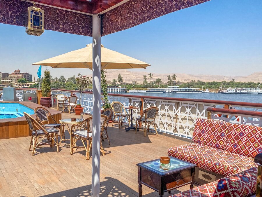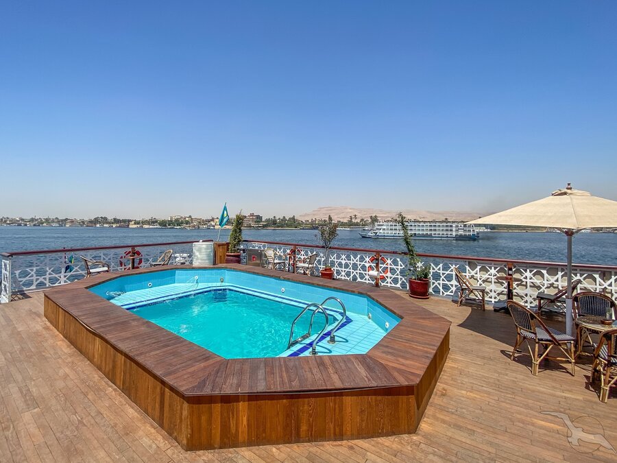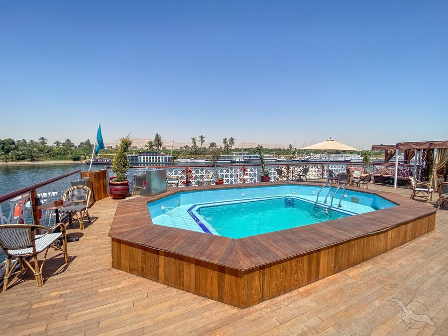 Ganz exklusiv reisen Sie mit unserer hochwertig erneuerten MS Club Vision (Landeskategorie 5 Sterne de Luxe). Wir bieten Ihnen auf dem komplett umgebauten Nilschiff im kommenden Jahr unsere beliebtesten Nilkreuzfahrtprogramme in persönlicher, ganz besonderer Atmosphäre an. Die "neue" MS Club Vision verfügt nach dem umfangreichen Umbau über 11 geräumige Deluxe-Außenkabinen und 2 Suiten im Bugbereich, die im orientalischen Design stilvoll eingerichtet sind. Auf unseren Reisen bieten wir Ihnen zukünftig den Charme einer Dahabeya-Segelkreuzfahrt in kleiner Gruppe, ohne an Bord auf die Annehmlichkeiten eines erstklassigen und mit allen Vorzügen ausgestatteten Nilschiffs verzichten zu müssen. Auf dem eleganten Sonnendeck befindet sich ein Swimmingpool (Badetücher inklusive) und eine Bar mit Sitzterrasse unter Sonnensegeln. Dort verfügt jede Kabine über einen privaten Schattenplatzbereich mit zwei Sonnenliegen. Das vollklimatisierte Schiff verfügt über Rezeption, Eingangsbereich, Lounge/Bar, Restaurant, Boutique, Massagebereich, Fitness-Ecke, Wäscheservice und kostenfreies WLAN in der Lounge (eingeschränkter Empfang). Eine aufmerksame Schiffscrew verwöhnt Sie mit erstklassigem Service und macht Ihren Aufenthalt zu einem unvergesslichen Erlebnis.