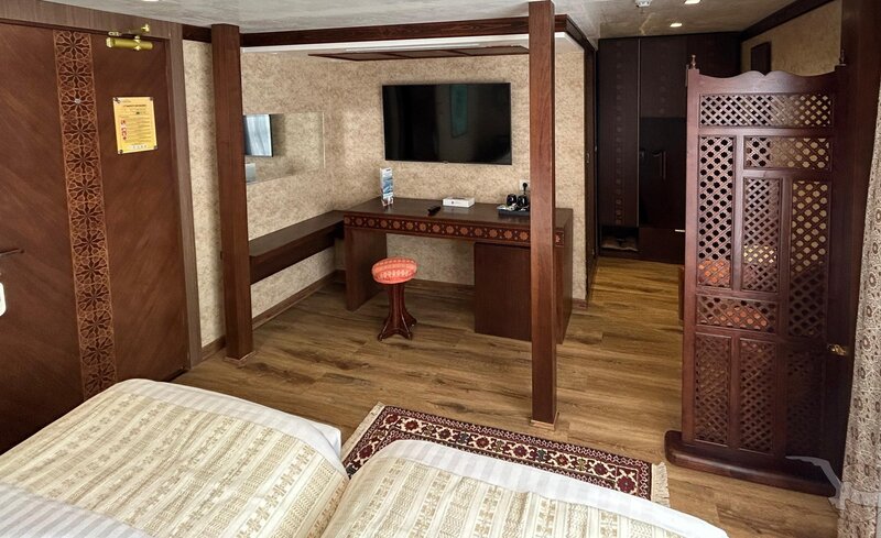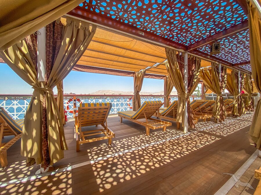 Die Kabinen liegen außen, im orientalischen Stil modern eingerichtet und verfügen über einen französischen Balkon. Ausstattung: Dusche/WC, Föhn, regulierbare Klimaanlage, SAT-TV, gefüllte Minibar (bei Verpflegung all inclusive light), Teekocher, Schiffstelefon und Privatsafe. Kabinengröße ca. 22 m².