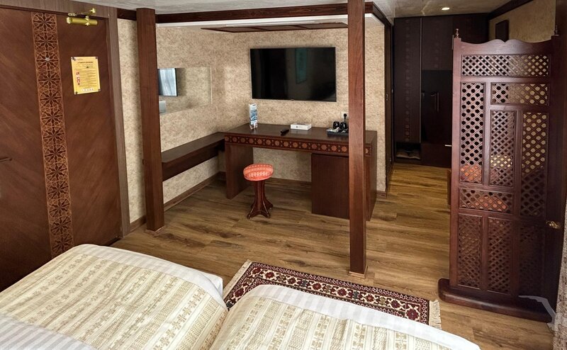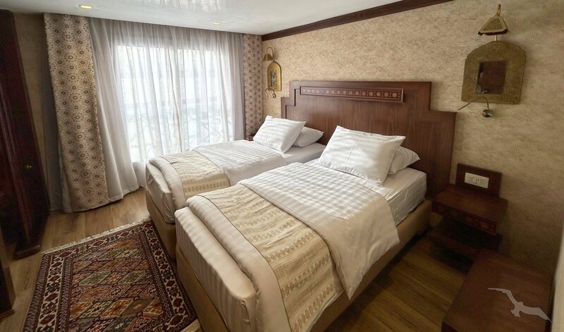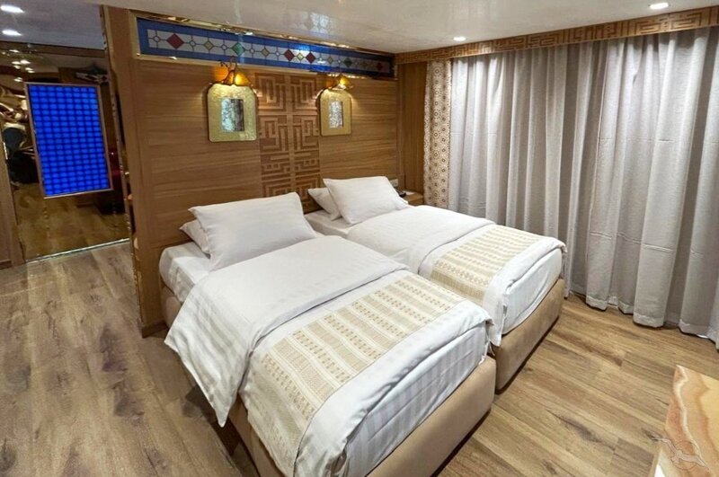 Die Kabinen liegen außen, im orientalischen Stil modern eingerichtet und verfügen über zwei französische Balkone. Ausstattung: Dusche/WC, Föhn, regulierbare Klimaanlage, SAT-TV, gefüllte Minibar (bei Verpflegung all inclusive light), Teekocher, Schiffstelefon und Privatsafe. Kabinengröße ca. 22 m².