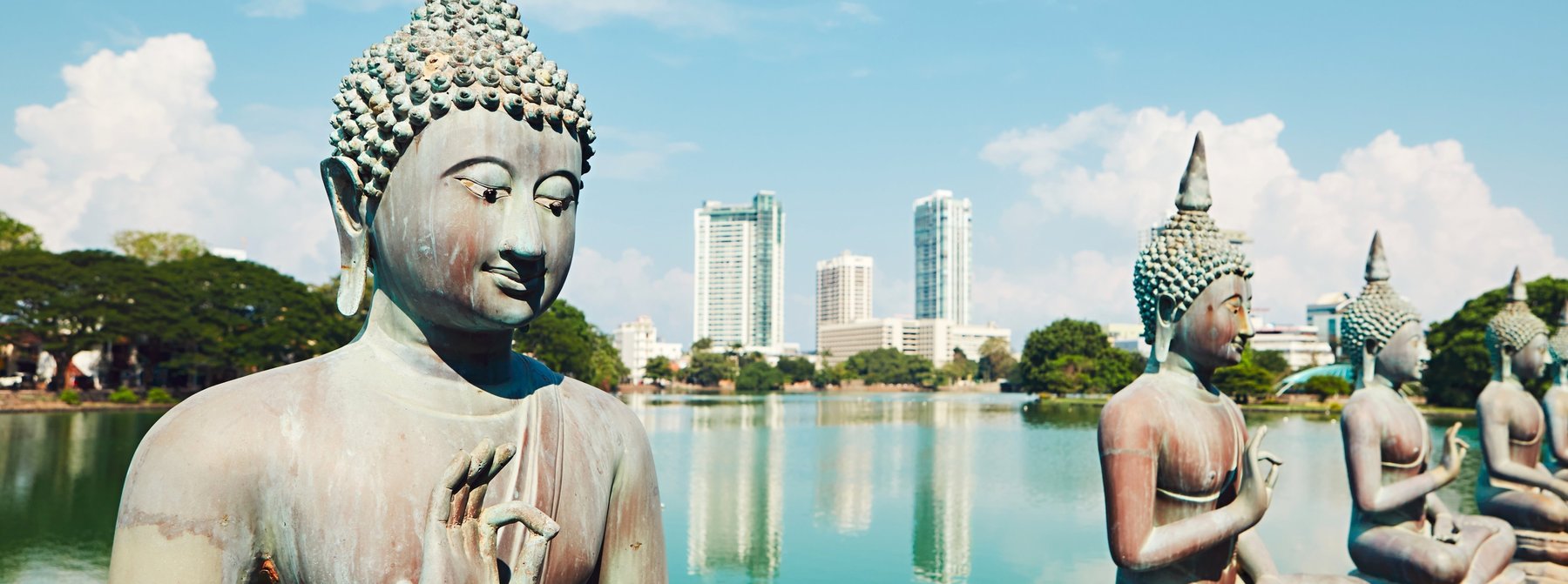 Buddhastatuen vor der Skyline Colombos, Sri Lanka