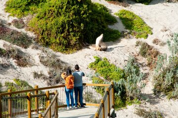 Kurzer Bustransfer zum Jachthafen und Umstieg in einen Katamaran. Während einer ausführlichen Hafenrundfahrt passieren Sie Fischfabriken und erhalten interessante Informationen über die Abläufe dieses wichtigen Wirtschaftszweigs Namibias. Dann fahren Sie hinaus auf den Atlantik auf der Suche nach Kap-Pelzrobben und Delphinen, die gerne nah am Boot mitschwimmen und ihre Schwimmkünste vorführen. Unterwegs kosten Sie frische Austern mit Sekt/Erfrischungsgetränk.
