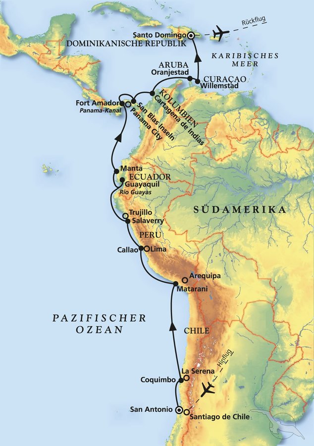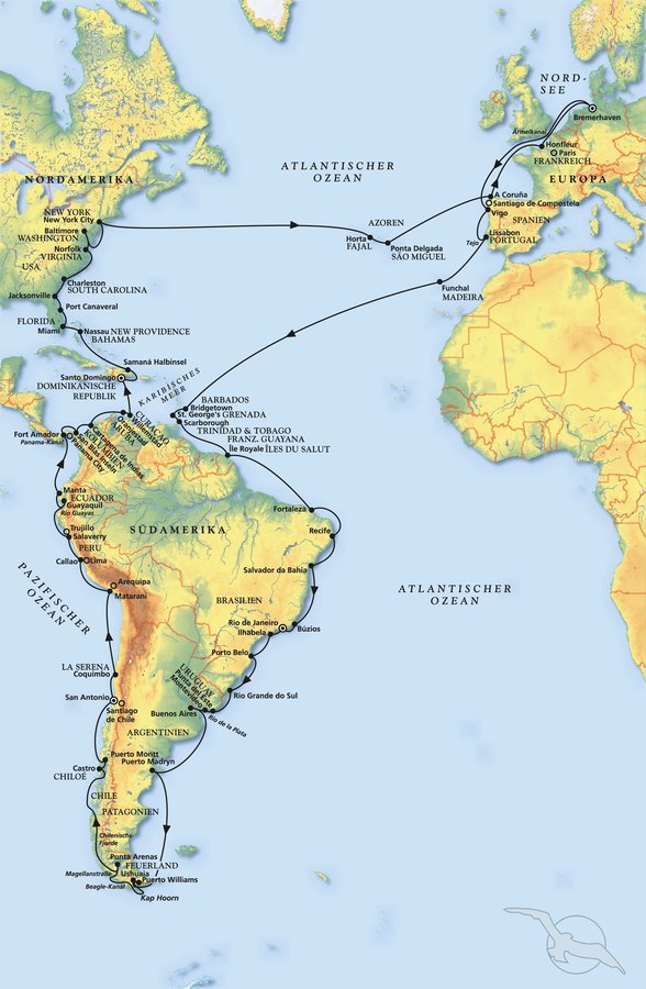 Savona - Mindelo - Bridgetown - Salvador da Bahia - Rio de Janeiro - Feuerland - Callao (Lima) - Panama-Kanal - Santo Domingo - New York - Bremerhaven