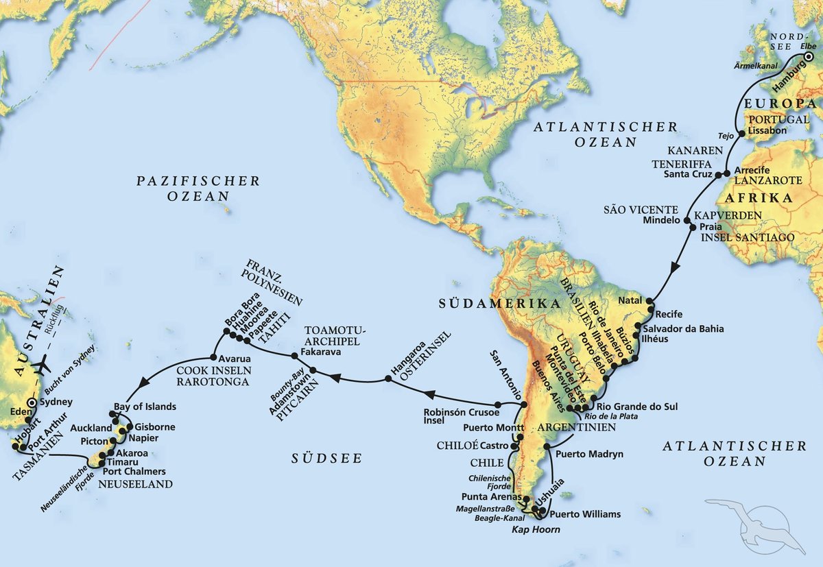 Savona - Santa Cruz(Teneriffa) - Guadeloupe - Panama-Kanal - Puntarenas - Papeete - Cook-Inseln - Auckland - Cairns - Darwin - Denpasar - Kuala-Lumpur - Malé - Mombasa - Kapstadt - Dakar - Las-Palmas(Gran Canaria) - Portsmouth - Bremerhaven
