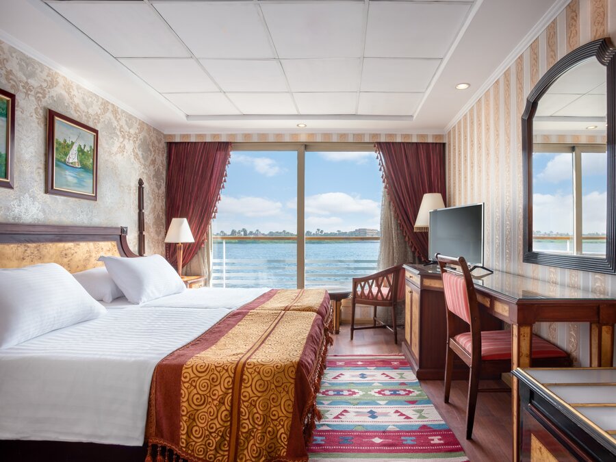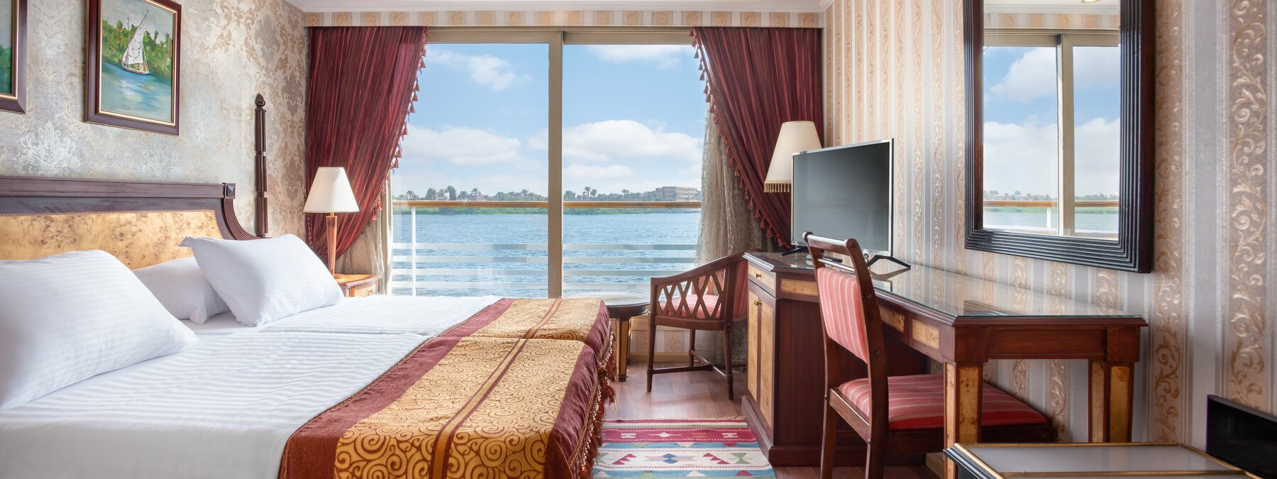 Alle Schiffe verfügen über Außenkabinen, die auf dem mittleren (Rezeption) und den oberen Decks mit französischem Balkon ausgestattet sind. Kabinen auf dem unteren Deck (Nildeck) verfügen über nicht zu öffnende Fenster. Die besonders komfortabel und geschmackvoll eingerichtet Kabinen verfügen über Dusche/WC oder Bad/WC, Föhn, regulierbare Klimaanlage, SAT-TV, Musikkanal, Schiffstelefon, Kühlschrank, Privatsafe, kleine Sitzecke, Kabinenservice, Stromspannung 220 V. Wechselstrom. Die Größe der Zweibettkabinen liegt zwischen 18 und 20 m². Die Suiten (ca. 40m²) auf Nile Vision verfügen über getrennten Wohn- und Schlafraum sowie Jucuzzi im Bad.