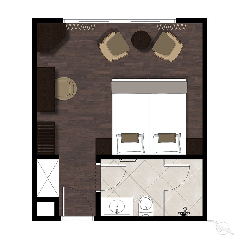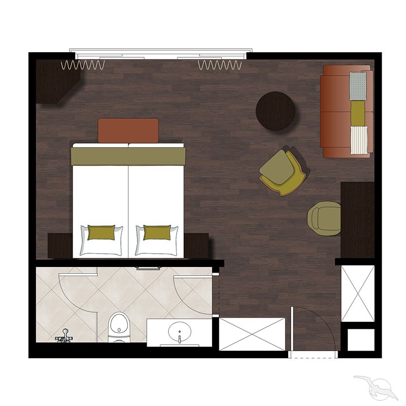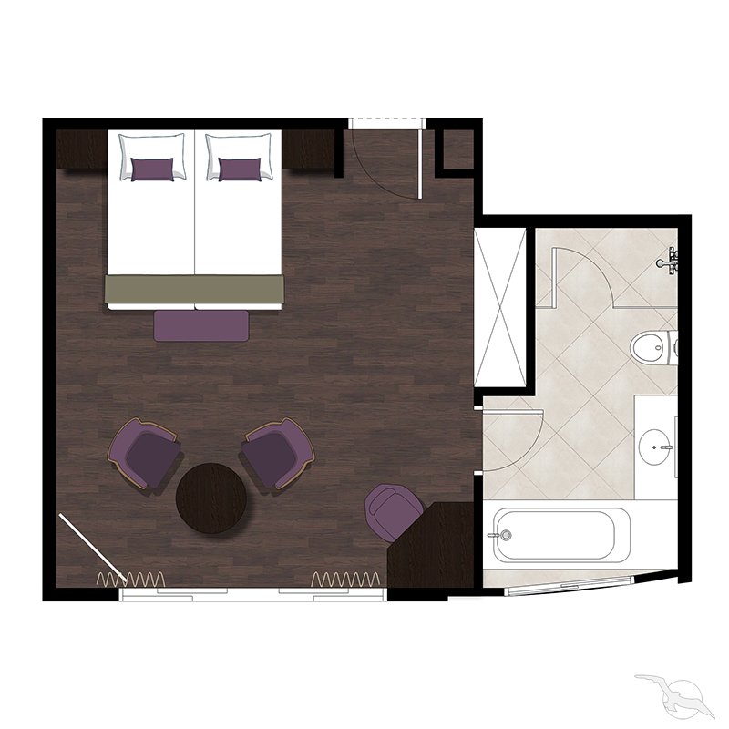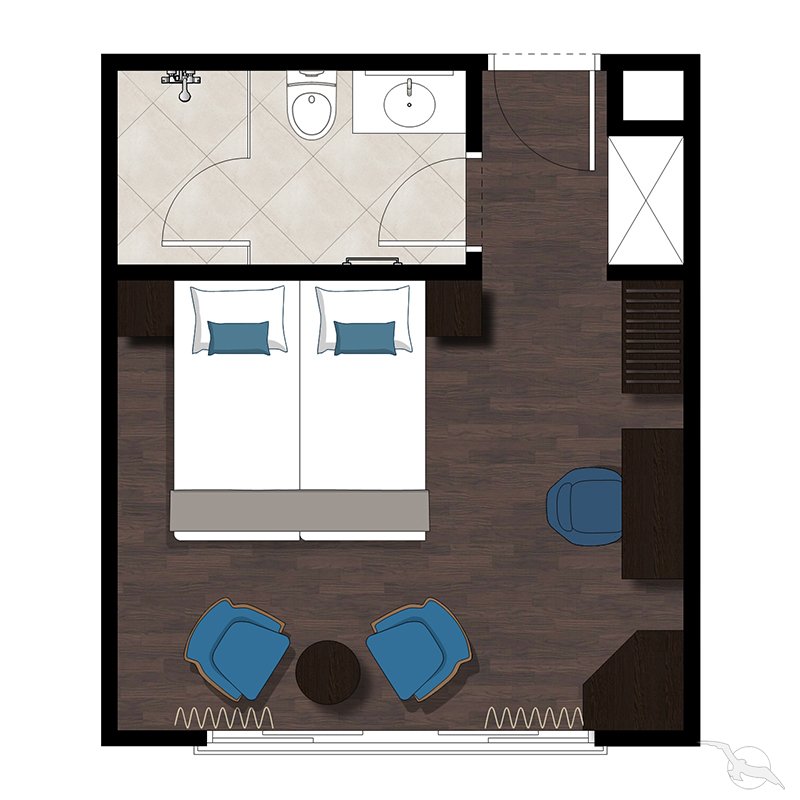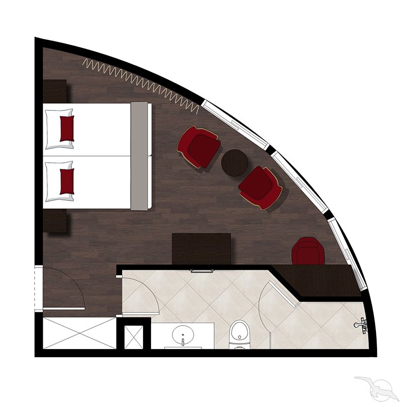 Die Kabinen liegen alle außen und sind komfortabel eingerichtet mit Klimaanlage, Dusche/WC. Queen-Size-Bett (wahlweise als Doppel- oder Einzelbetten) und verfügen über einen französischen Balkon . Kabinengröße ca. 24 qm.