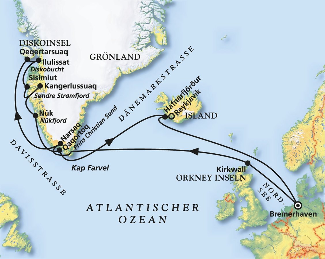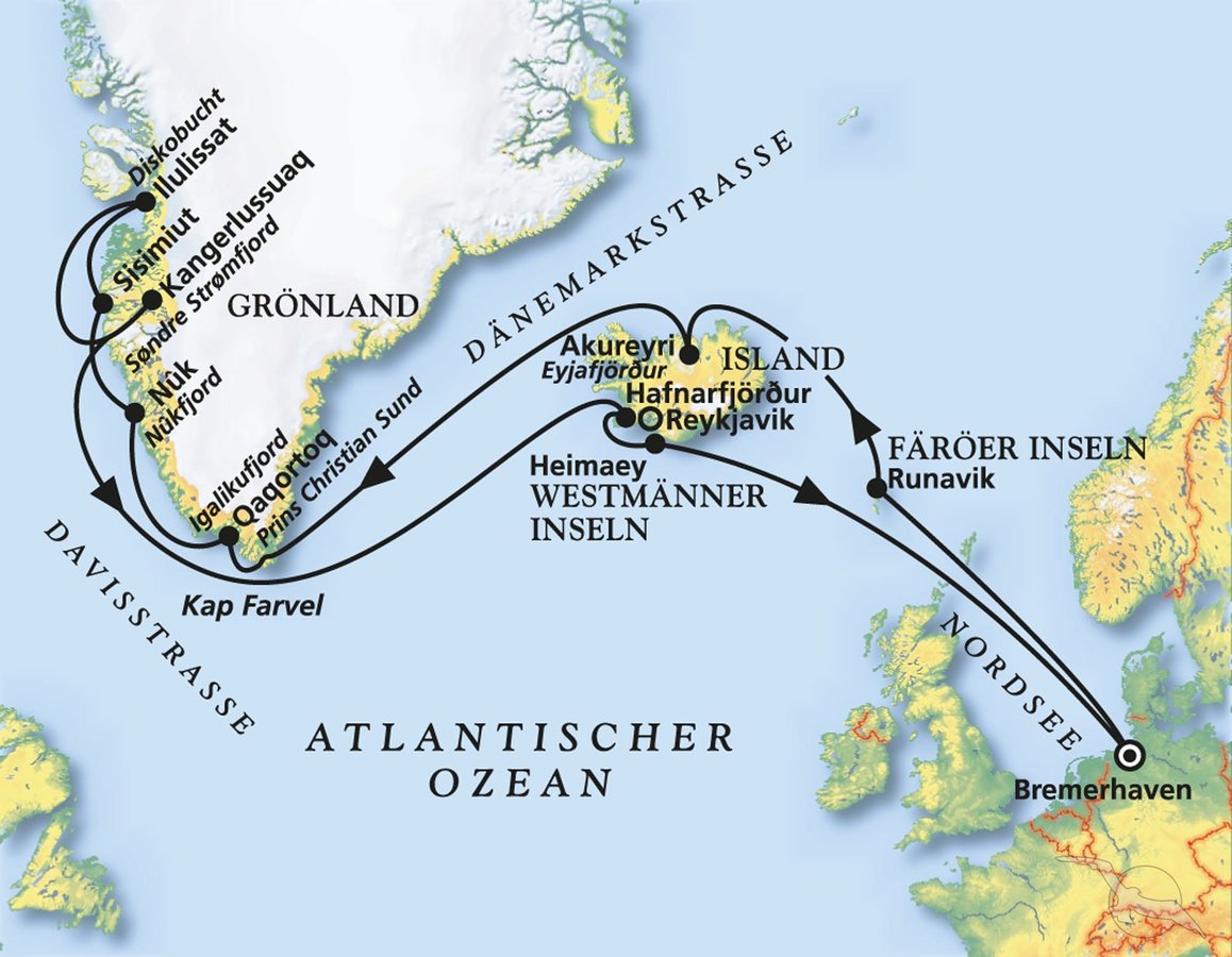 Bremerhaven - Husavik - Isafjördur - Ammassalik - Sisimiut - Ilulissat - Nuuk - Narsaq - Bremerhaven