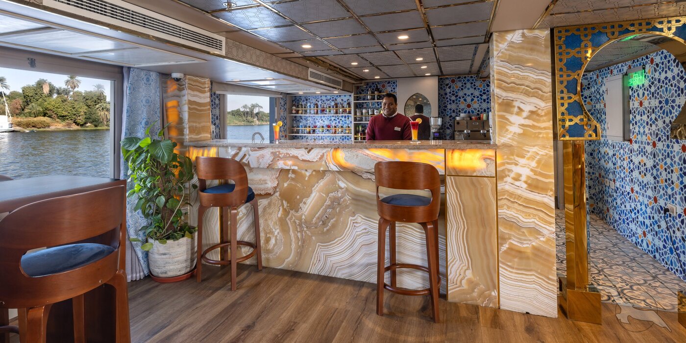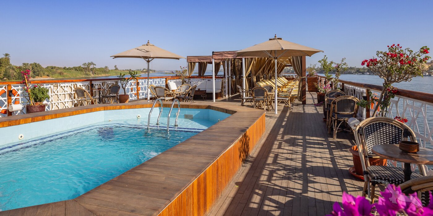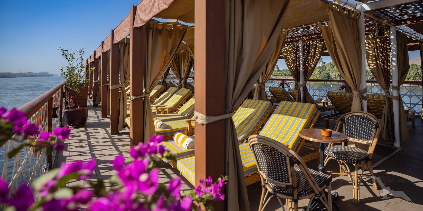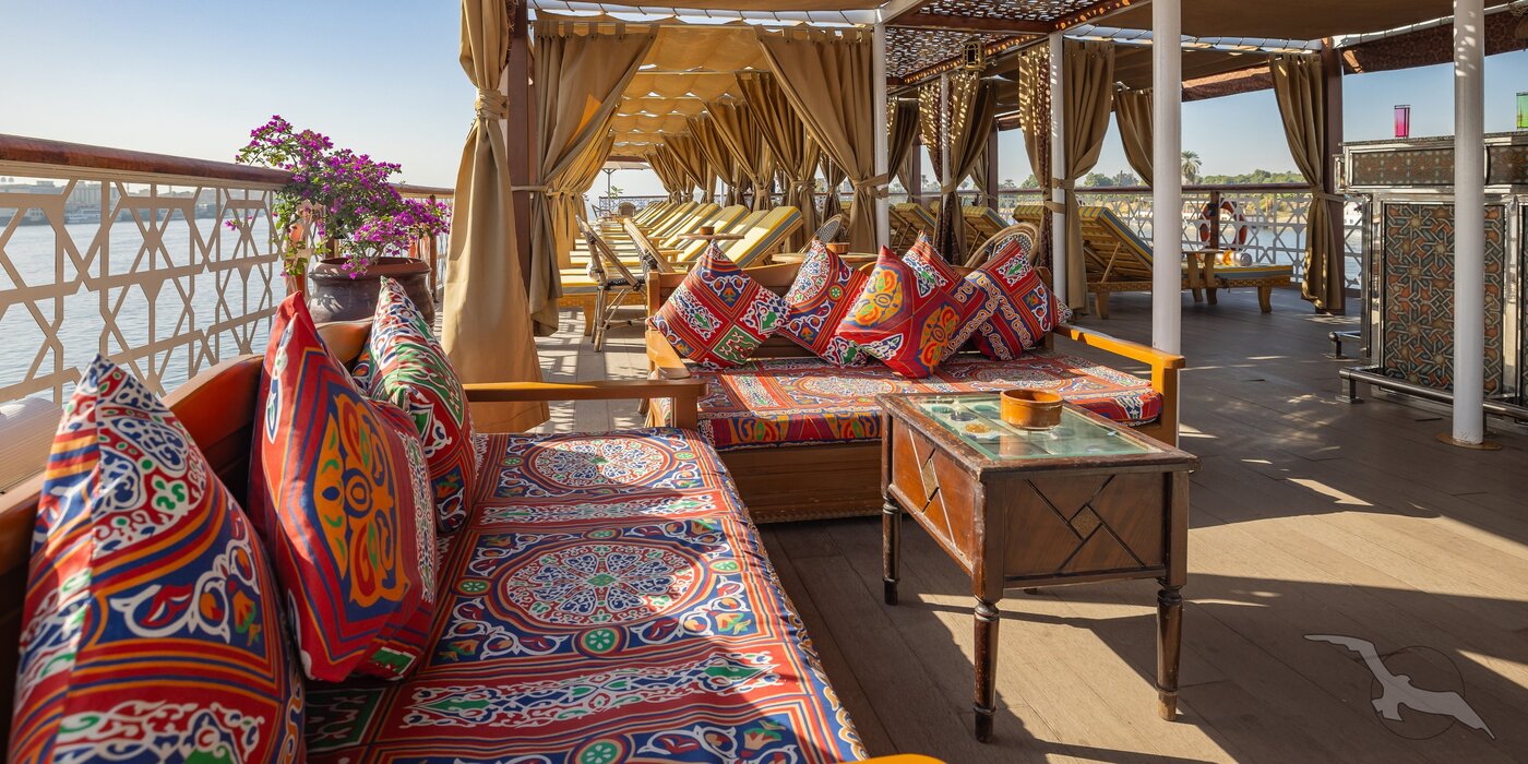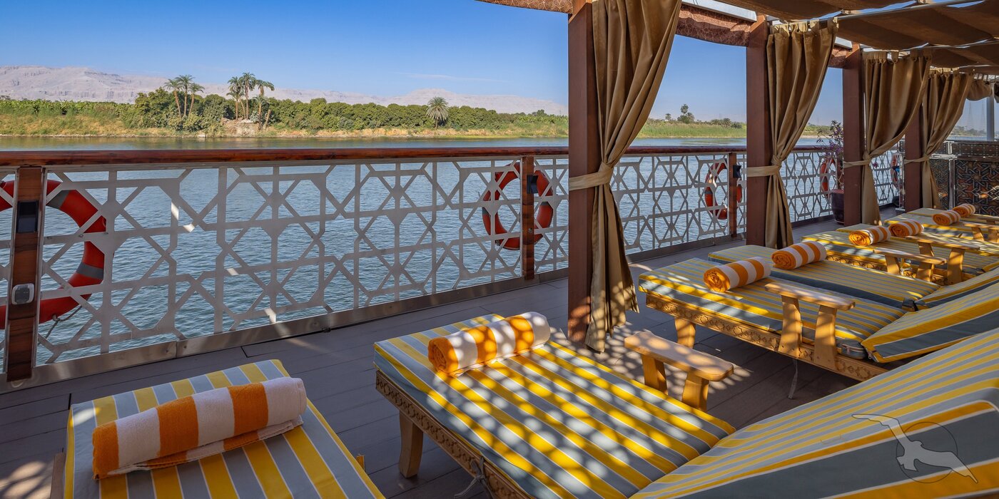 Die große Flussreise auf der gesamten Nilstrecke entlang der antiken Tempel und Pharaonengräber zwischen Kairos Pyramiden, der Echnaton-Hauptstadt Tell el-Amarna, Luxor, Karnak und Theben-West bis zu Assuans Nilkatarakten begeistert seit vielen Jahren unser Kreuzfahrtpublikum in Ägypten. Einzigartig sind die Flusspassagen entlang des malerisch grünen Niltals mit der dahinterliegenden Bergwüste bei angenehm verträglichem Wüstenklima. Begeben Sie sich auf die Spuren der Dynastien des alten und neuen Reichs und besuchen Sie deren herausragende Baudenkmäler. Exklusiv und erstklassig kreuzen Sie mit unserer komplett umgebauten MS Club Vision direkt vor die Tore der zahlreichen Sehenswürdigkeiten während Sie an Bord eine all inclusive light Verpflegung genießen. Das mit nur 13 großzügig gestalteten Deluxe-Kabinen ausgestattete Nilschiff verleiht Ihrer Reise einen exklusiven Flair in privater Atmosphäre. Während der ausgiebigen Flusspassagen erholen Sie sich auf einem komfortabel ausgestatteten Sonnendeck, auf welchem jede Kabine über einen privaten Schattenplatzbereich mit Sonnenliegen verfügt.