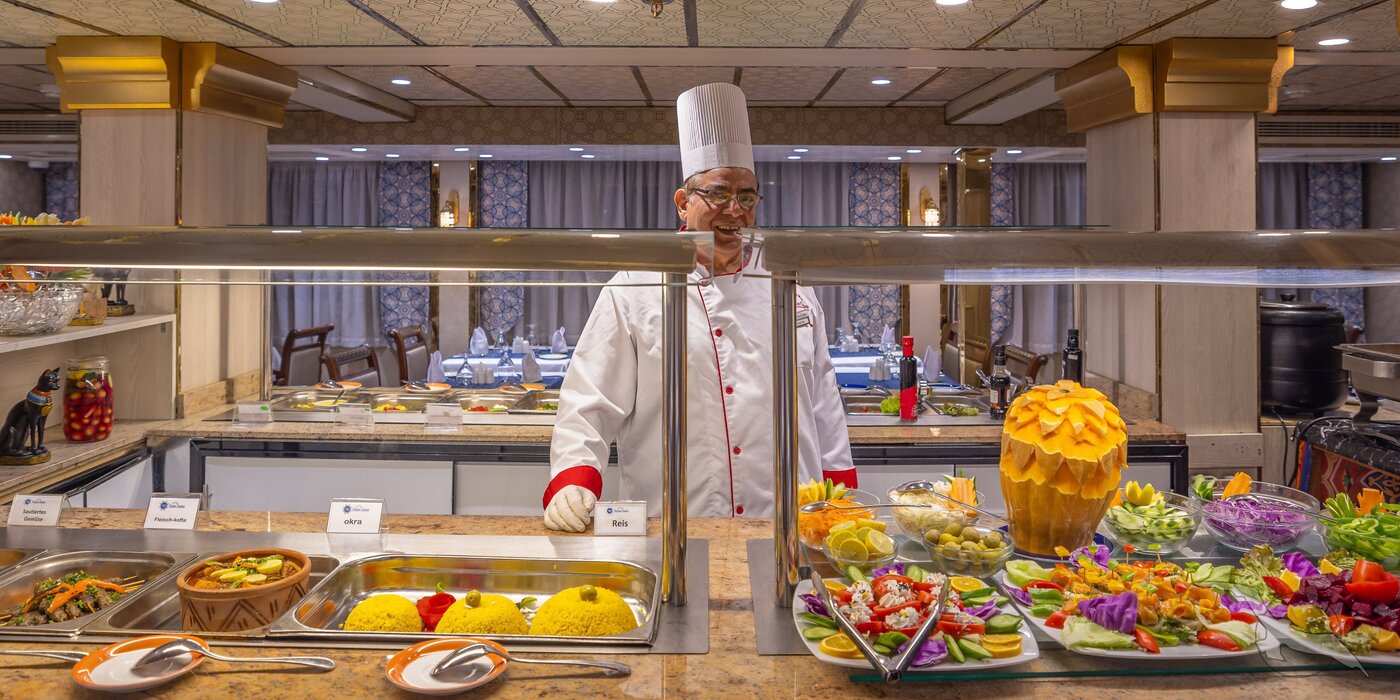 All inclusive light: Speiseangebot zu den drei Tischzeiten mit internationaler und orientalischer Küche zum Kennenlernen. Frühstücksbuffet, reichhaltiges und abwechslungsreiches Mittags- und Abendbuffet mit Themenabenden (z.B. asiatisch/orientalisch/italienisch), täglich Tee-/Kaffeestunde mit Snacks und Gebäck auf dem Sonnendeck. Heißgetränke und Softdrinks wie Café, Cappuccino, Wasser, Cola, Sprite und Säfte während der gesamten Kreuzfahrt von 09:00 - 24:00 Uhr sowie lokaler Wein und lokales Bier während Mittag- und Abendessen inklusive. Frische Säfte der Saison gegen Aufpreis. In der Kabine gefüllte Minibar mit Softdrinks.