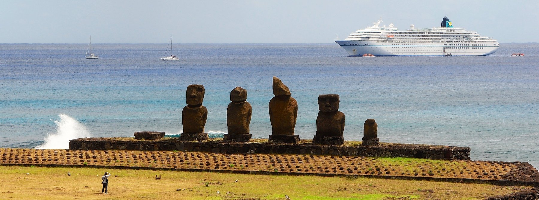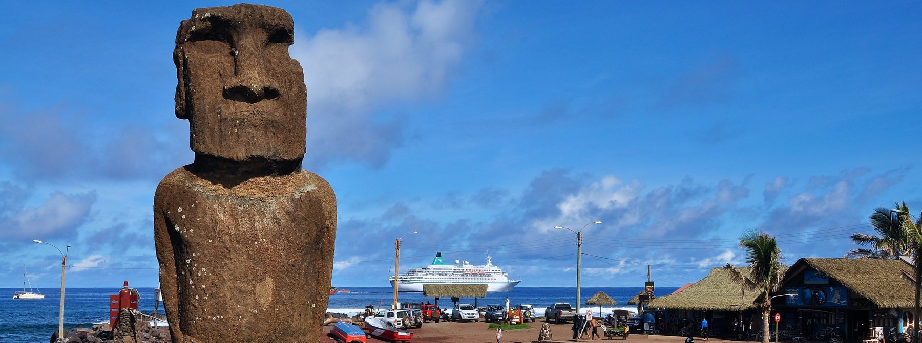 Zunächst besuchen Sie die Zeremonienstätte Tahai mit drei restaurierten Plattformen, den Ahus, und ihren wiederaufgerichteten Statuen, den Moais. Sie sehen den einzigen Moai, dem seine Augen wieder eingesetzt wurden. Weitere Strukturen, die Sie dort erkennen können, sind ein restauriertes Hühnerhaus (Hare Moa), ein Bootshaus (Hare Paenga) und eine große Bootsrampe. Dann verlassen Sie den Ort Hangaroa und durchqueren die Insel, bis Sie in Anakena an der Nordostküste der Osterinsel ankommen. Hier besuchen Sie die restaurierten Ahus Nau Nau und Ature Huki. Der Legende nach ist Anakena der Ort, wo der berühmte König Hotu Matu’a die erste Ansiedlung der Polynesier errichtete. Hier können Sie auch unter Palmen den Südseezauber der Osterinsel genießen. Anschließend fahren Sie zurück in Richtung Hangaroa und besuchen das Ahu Akivi, das im Inselinneren liegt und eine der wenigen Plattformen präsentiert, deren Statuen mit Blick auf das Meer aufgerichtet wurden. Die Legende sagt, dass die Moais Kundschafter darstellen, die vom König Hotu Matu’a nach Rapa Nui geschickt wurden, um die Insel zu erforschen. Rückfahrt zum Schiff.