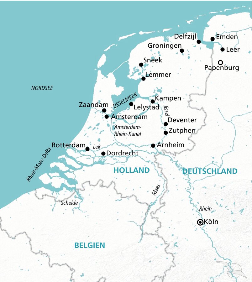 MS Rhein Prinzessin nimmt Sie mit auf Kurs durch Holland und Ostfriesland. Ihre Reise beginnt in Köln und führt Sie zum Auftakt nach Rotterdam. Bereits am nächsten Tag steht die Amstel-Metropole Amsterdam auf dem Programm mit der Möglichkeit zu diversen Ausflügen. Über Seen und Kanäle steuert Ihr Schiff durch die grünste Provinz der Niederlande. In Ostfriesland angekommen, genießen Sie eine Tasse typischen Ostfriesentees oder erkunden Sie die Wunderwelt der Schiffsbauer auf der Meyer Werft in Papenburg. Malerische Städtchen voller Tradition, wie das hübsche Delfzijl und Sneek mit Wasserpforte, laden zum Landgang ein. Von hier überqueren Sie das Ijsselmeer. Nach Aufenthalten in Kampen, Deventer und Zutphen endet Ihre Reise in Köln.