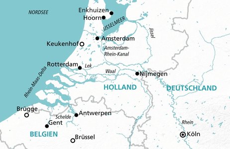 Kanäle, Flüsse und Meeresarme durchziehen Holland und Belgien und führen Sie zu pittoresken Städtchen und pulsierenden Hafenstädten wie Amsterdam, Rotterdam und Antwerpen. Im malerischen Städtchen Enkhuizen am westlichen Ijsselmeer erleben Sie auf einem Rundgang die typische Atmosphäre aus dem "goldenen Jahrhundert". Während einer langen Liegezeit bietet sich die beste Möglichkeit, die Amstel-Metropole Amsterdam und das Umland kennenzulernen. Besuchen Sie das schöne Brüssel auf einem Ausflug ab Antwerpen und erleben Sie den imposanten Grande Place. Romantisch und bezaubernd, eine Stadt wie im Bilderbuch, ist Brügge. Über Scheide und Waal nimmt Ihr Schiff Kurs auf den Rhein und nach einer erholsamen Nacht an Bord geht Ihre Reise in Köln zu Ende.