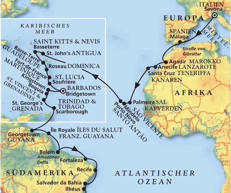 Vom Hafen aus fahren Sie mit dem Bus zunächst zum modernen Vorort Barra mit seinem berühmten Leuchtturm, an der Mündung der Bucht gelegen, dann weiter in den historischen Teil der Stadt, Pelourinho, mit dem größten und am besten erhaltenen Komplex von Kolonialarchitektur in Südamerika. Sie unternehmen einen Rundgang, schlendern durch die engen, belebten Straßen, die von Gebäuden in Pastelltönen vergangener Zeiten gesäumt sind, und genießen die Sehenswürdigkeiten und Klänge dieser pulsierenden Stadt. Sie besuchen die Kirche von São Francisco mit ihrem üppigen barocken Golddekor und den Pelourinho-Platz, das Herz der Altstadt. Anschließend nehmen Sie Ihr Mittagessen in einem landestypischen Restaurant ein. Weiterfahrt in den unteren Teil der Stadt. Zunächst besuchen Sie Igreja de Nosso Senhor do Bonfim ("Kirche unseres Herrn von Bonfim"), die 1754 eingeweiht wurde. Die Kirche liegt auf einem Hügel und beherrscht die Halbinsel Itapagipe. Sie ist eine der beliebtesten Kirchen in Brasilien, die die gemischten Religionen des Landes repräsentiert. Der nächste Halt wird am Forte de Monte Serrat unternommen. Dieser militärische Bau von 1587 verbindet mittelalterliche und koloniale Architektur. Der Ort bietet einen Panoramablick auf die All Saints Bay ("Allerheiligenbucht"). Durch die Vororte, die die Bucht umgeben, erreichen Sie das Herz der Innenstadt. Dort finden Sie den größten Kunsthandwerkermarkt der Stadt, den berühmten Mercado Modelo, der sich im alten Zollhaus befindet. Dieser Markt vereint die Kunst Bahias und des Nordostens. Etwas Freizeit und Gelegenheit für Einkäufe und Rückkehr zum Schiff.