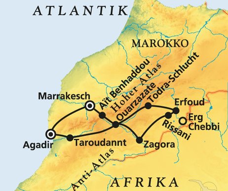 Der Süden Marokkos verzaubert die Besucher durch ein ausgeprägtes und vielseitiges Landschaftsbild zwischen schneebedeckten Gebirgsketten des Hohen Atlas und den malerischen Sanddünen des großen Sandmeers, Erg Chebbi. Marrakesch, die wohl faszinierendste Königsstadt des Landes, ist Ausgangspunkt Ihrer Reise, die Sie zu den berühmten Lehmburgen der Kasbahs und üppig grünen Flussoasen führt. Erleben Sie die bezaubernde Schönheit der Natur mit spektakulären Gebirgsschluchten, palmengesäumten Tälern sowie den charakteristischen Wehrdörfern der Berber, wie dem berühmten UNESCO-Weltkulturerbe Ait Benhaddou. Auf der sehenswerten Route entlang der Straße der Kasbahs bis zur Atlantikküste lernen Sie die charakteristischen Städte des Südens Ouarzazate, Zagora, Erfoud und Taroudannt kennen.