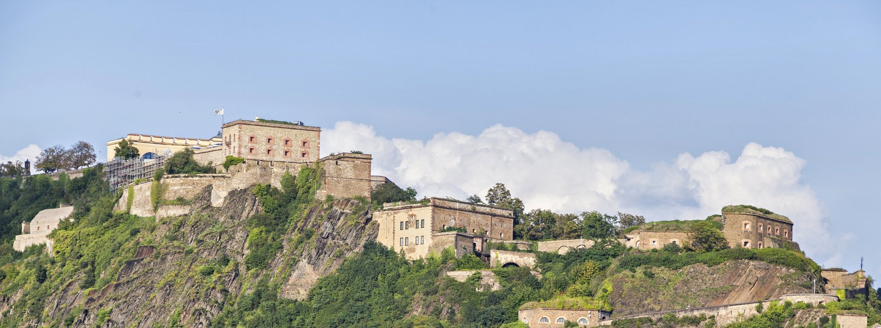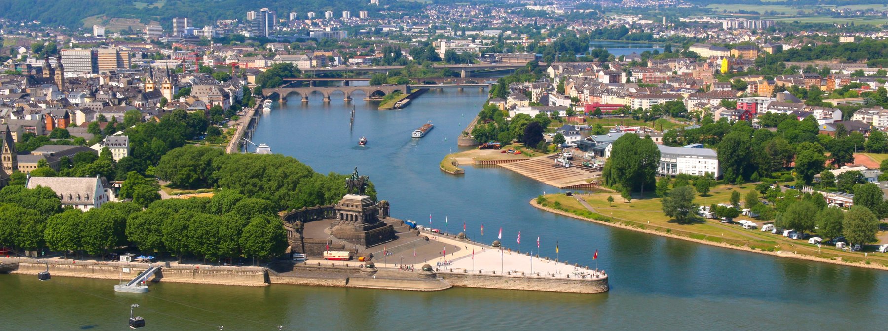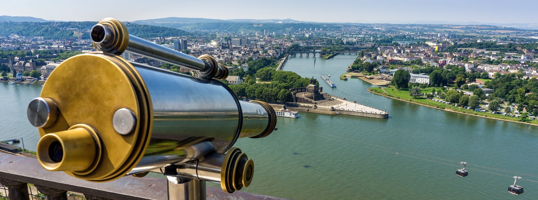 Von der Anlegestelle aus erkunden Sie zunächst die Altstadt von Koblenz mit ihren liebevoll restaurierten Fachwerkhäusern und verwinkelten Gassen. Anschließend schweben Sie mit der für die Bundesgartenschau 2011 eigens gebauten Kabinenbahn in vier Minuten über den Rhein zur Festung Ehrenbreitstein. Der Ehrenbreitstein ist seit gut 3000 Jahren befestigt und besiedelt. Die heutige Festung entstand 1817-1828 unter Verwendung alter Steine und Fundamente. Genießen Sie den gigantischen Ausblick auf die Stadt, den Zusammenfluss von Rhein und Mosel und auf das Kaiser-Wilhelm-Denkmal am Deutschen Eck, bevor Sie die Talfahrt antreten und zum Schiff zurückspazieren.