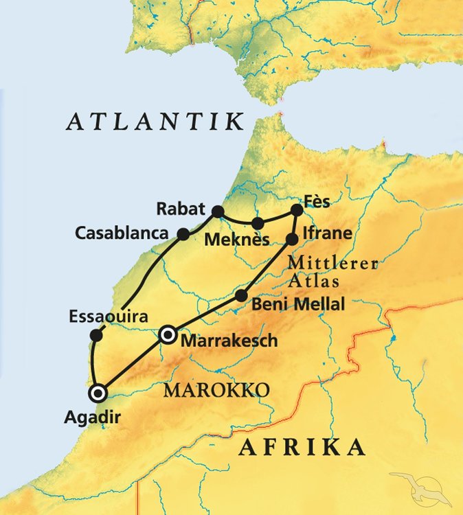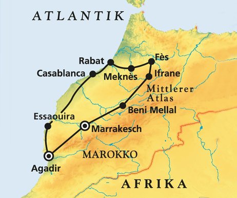 Erleben Sie auf einer sehenswerten Rundreise historische Residenzstädte der alten Kalifen zwischen Marokkos Atlantikküste und den malerischen Atlas-Gebirgsketten. Im Land der Mauren und Berber besuchen Sie dabei die vier bedeutenden Königsstädte Marrakesch, Meknès, Fès, mit der heutigen Hauptstadt Rabat sowie die moderne Metropole Casablanca und das malerische Küstenstädtchen Essaouira. Sie erfahren alles Wissenswerte über Land und Leute und wandeln auf den Spuren der einstigen Eroberer, die über viele Jahrhunderte große Teile der Iberischen Halbinsel verwalteten und geprägt haben. Ideal für einen erholsamen Anschluss geeignet, sind die zahlreichen Hotels an den Stränden Agadirs und Umgebung, die ganzjährig zum Baden einladen.