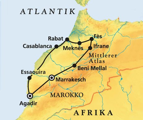 Erleben Sie auf einer sehenswerten Rundreise historische Residenzstädte der alten Kalifen zwischen Marokkos Atlantikküste und den malerischen Atlas-Gebirgsketten. Im Land der Mauren und Berber besuchen Sie dabei die vier bedeutenden Königsstädte Marrakesch, Meknès, Fès, mit der heutigen Hauptstadt Rabat sowie die moderne Metropole Casablanca und das malerische Küstenstädtchen Essaouira. Sie erfahren alles Wissenswerte über Land und Leute und wandeln auf den Spuren der einstigen Eroberer, die über viele Jahrhunderte große Teile der Iberischen Halbinsel verwalteten und geprägt haben. Ideal für einen erholsamen Anschluss geeignet, sind die zahlreichen Hotels an den Stränden Agadirs und Umgebung, die ganzjährig zum Baden einladen.
