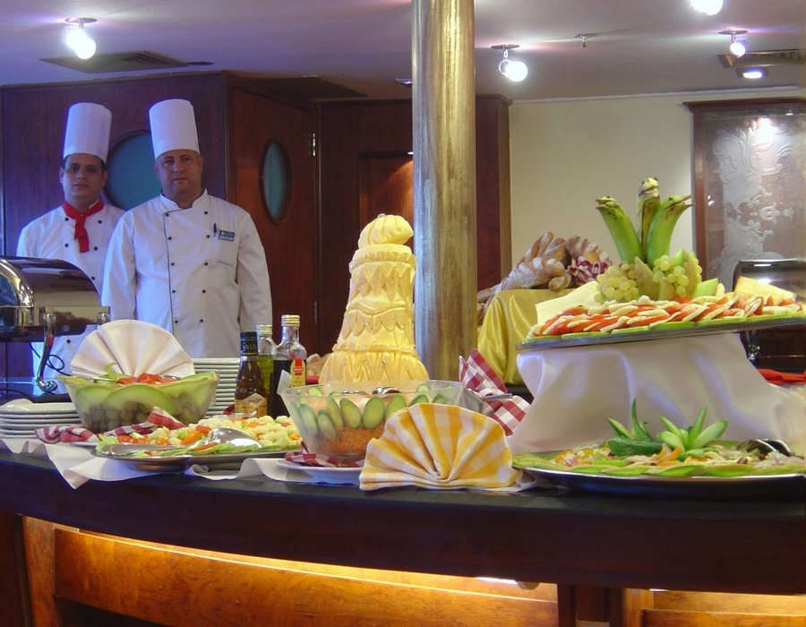 Vollpension mit internationaler Küche, Frühstück, Mittag- und Abendessen an reichhaltigen und abwechslungsreichen Buffets. Nachmittags Tee-/Kaffeestunde mit Gebäck auf dem Sonnendeck. Je nach Reise ein orientalisches Spezialitätenbuffet oder ein Barbecue-Grillabend an Deck. Der Verpflegungsstandard entspricht den Hotels gleicher Kategorie in Ägypten. Wahlweise haben Sie die Möglichkeit, auf unseren Komfort-Class-Schiffen all inclusive-Verpflegung zu buchen (alkoholfreie Getränke, wie Softdrinks, Kaffee, Cappuccino, alkoholische Longdrinks und alkoholfreie Cocktails sowie lokales Bier, einheimische Spirituosen und Wein sind zwischen 09:00 - 23:00 Uhr inklusive).