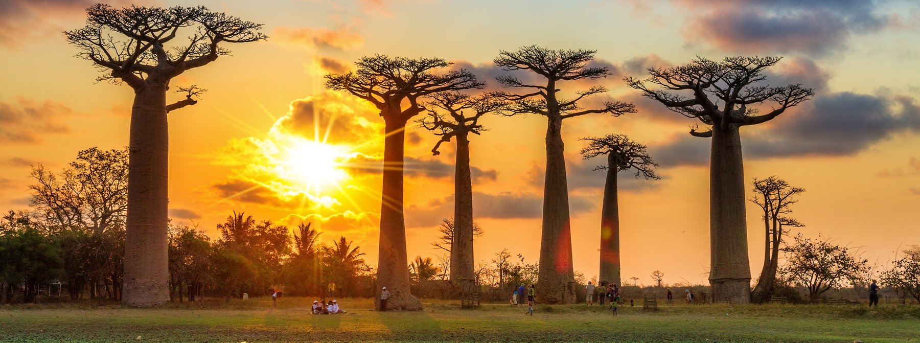 Baobab, oder auch Affenbrotbäume genannt, sind die wohl berühmtesten Vertreter der madagassischen Flora und von recht skurrilem Aussehen. Die bis zu 2.000 Jahre alten Urbäume wachsen 30 Meter hoch, und erinnern mit ihrem dickem Stamm und den relativ verzweigten Astkronen an verkehrt herum gepflanzte Bäume, deren Wurzeln sich in den Himmel strecken. Auf Madagaskar säumen die 25 eindrucksvollsten von Ihnen die legendäre Baobab-Allee zwischen Morondava und Belo Tsiribihina im Westen der Insel, und liefern Besuchern besonders zum Sonnenuntergang bei Zwielicht atemberaubende Panoramen in bizarrer Kulisse. Besucher einer Madagaskar Kreuzfahrt, die die Baobab-Allee noch ein kleines Stückchen weiter Richtung Belo Tsiribihina entlang fahren, werden auf eine romantische Laune der Natur treffen. Dort stehen zwei einzelne Baumriesen, deren Baumstämme sich im Laufe der Jahrhunderte wie ein verliebtes Pärchen untrennbar ineinander verschlungen haben und als Baobab d’amour bezeichnet werden.