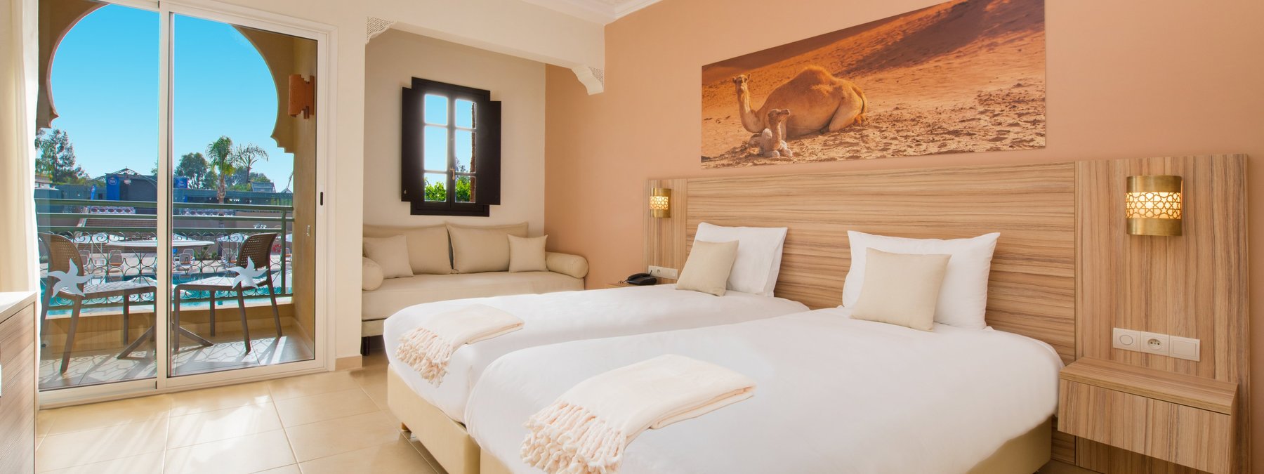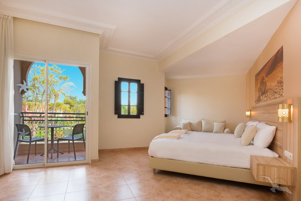 Doppelzimmer (DZ): Geschmackvoll und komfortabel eingerichtet (32qm) im marokkanischen Stil und ausgestattet mit Klimaanlage, Dusche/WC, Fön, Telefon, SAT-TV, WLAN (inklusive), Safe, Minikühlschrank (geg Gebühr) und Balkon oder Terrasse. Wahlweise mit Gartenblick (DG) buchbar.