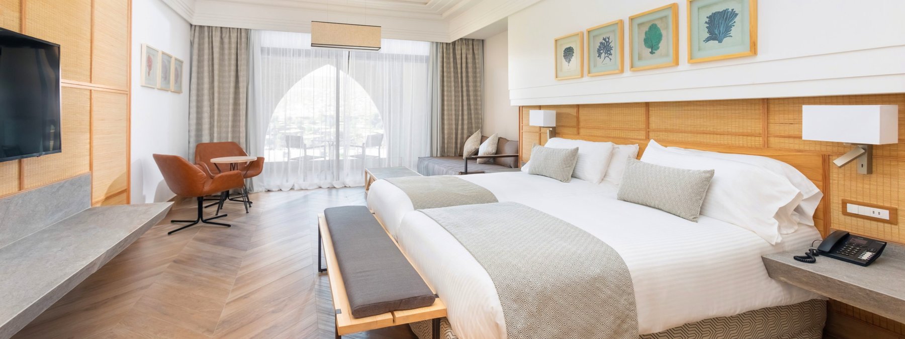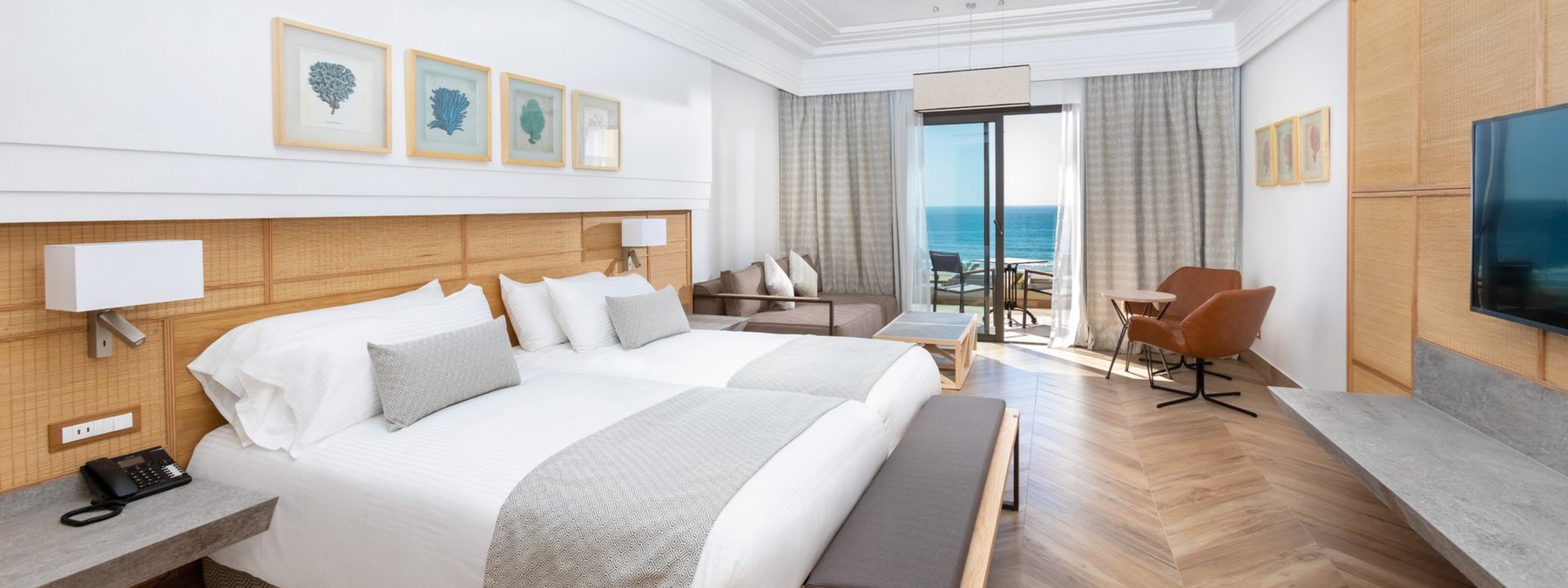 Doppelzimmer (DZ/DZE) Modern und geräumig (ca. 46 m²), mit Klimaanlage, WLAN, Dusche/WC, Föhn, Sofa, Telefon, SAT-TV, Mini- Kühlschrank, Safe und Balkon oder Terrasse. Wahlweise mit seitl. Meerblick (DKM/DK1) oder Meerblick (DZM/DEM) buchbar.
