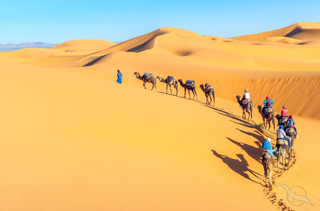 Fahrt durch die wunderschöne Oasenlandschaft, entlang verlassener Kasbahs und wilder Flussläufe. Halt an der historischen Karawanen-Oase von Rissani, bevor Sie Erfoud erreichen. Am Nachmittag haben Sie Gelegenheit, an einem ganz besonderen Wüstenerlebnis teilzunehmen. Fahrt zum großen Sandmeer „Erg Chebbi“ mit Wanderung in den riesigen Sanddünen. Ein unvergesslicher Sonnenuntergang wartet auf Sie (nicht inkl., buchbar vor Ort € 35, Kamelritt in den Sanddünen gegen Aufpreis möglich).