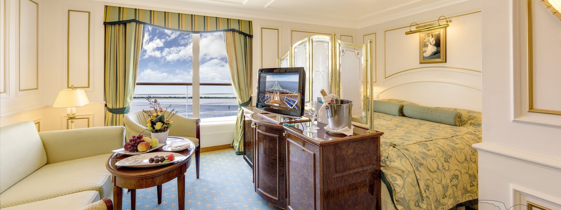 Zur Ausstattung gehören SAT-TV (Empfang abhängig vom Fahrgebiet), individuell regulierbare Klimaanlage, Telefon, Safe, Minibar, Föhn, WLAN (nicht inkl., Empfang abhängig vom Fahrgebiet). Die Bäder verfügen über Dusche/WC, Waschbecken und Spiegel. Kabinen ab der Kategorie T-W sind mit Bad/WC (außer U+ DU/WC) ausgestattet. Bademäntel in jeder Kabine zur Benutzung an Bord.  Handtücher und Badelaken werden auf Wunsch täglich gewechselt. Die Kabinen auf dem Kommodore-Deck und Admirals-Deck verfügen über einen französischen Balkon mit großer Schiebetür.