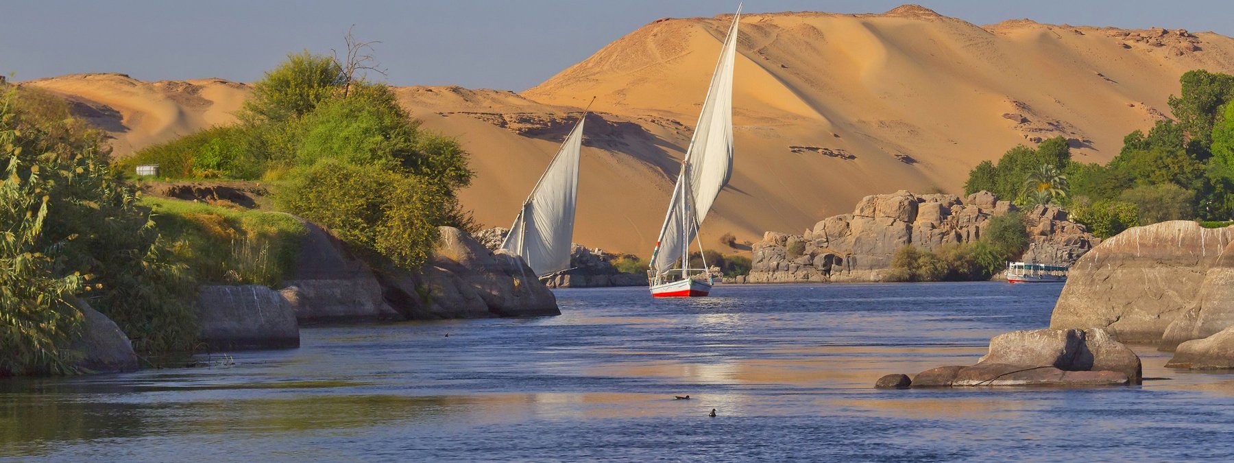 • Feluken auf dem Nil vor wunderschöner Nillandschaft bei Assuan, Ägypten