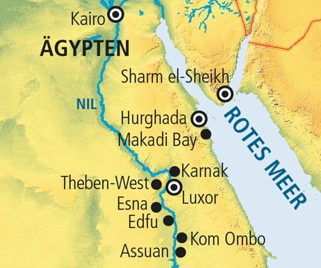 Unsere einwöchige Nilkreuzfahrt inklusive des klassischen Besuchsprogramms der bedeutendsten pharaonischen Sehenswürdigkeiten zwischen Luxor und Assuan. Dort liegen mit dem Tal der Könige und Karnak sowie rund um die südlichen Nilkatarakte vor dem gewaltigen Nasserstausee die Schwerpunkte der Reise. Während der Flussfahrten zwischen den beiden Orten erholen Sie sich auf dem Sonnendeck Ihres erstklassig ausgestatteten Nilschiffs, während Sie entlang malerischer Flussoasen mit der dahinterliegenden Wüste kreuzen. Unterwegs machen Sie Halt und bewundern weitere Höhepunkte wie Kom Ombos Doppeltempel und den gut erhaltene Horus Tempel von Edfu. Ein Abstecher zu den monumentalen Tempelanlagen Abu Simbels kann auf Wunsch von Assuan unternommen werden.