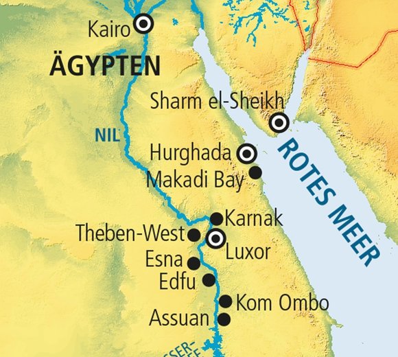 Luxor und Assuan an der Nilpromenade und in Kairo im Stadtteil Maadi. Je nach Aufkommen kann es an den Anlegestellen dazu kommen, dass mehrere Nilschiffe nebeneinander liegen, sodass die Sicht behindert sein kann und Geräusche/Gerüche von Nachbarschiffen nicht ausgeschlossen sind.