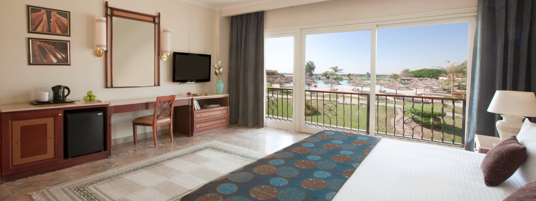 Deluxezimmer (DZD) Bei gleicher Ausstattung geräumiger (ca. 40 m²), modern eingerichtet mit Balkon oder Terrasse. Wahlweise mit Nilblick (DDN) buchbar.