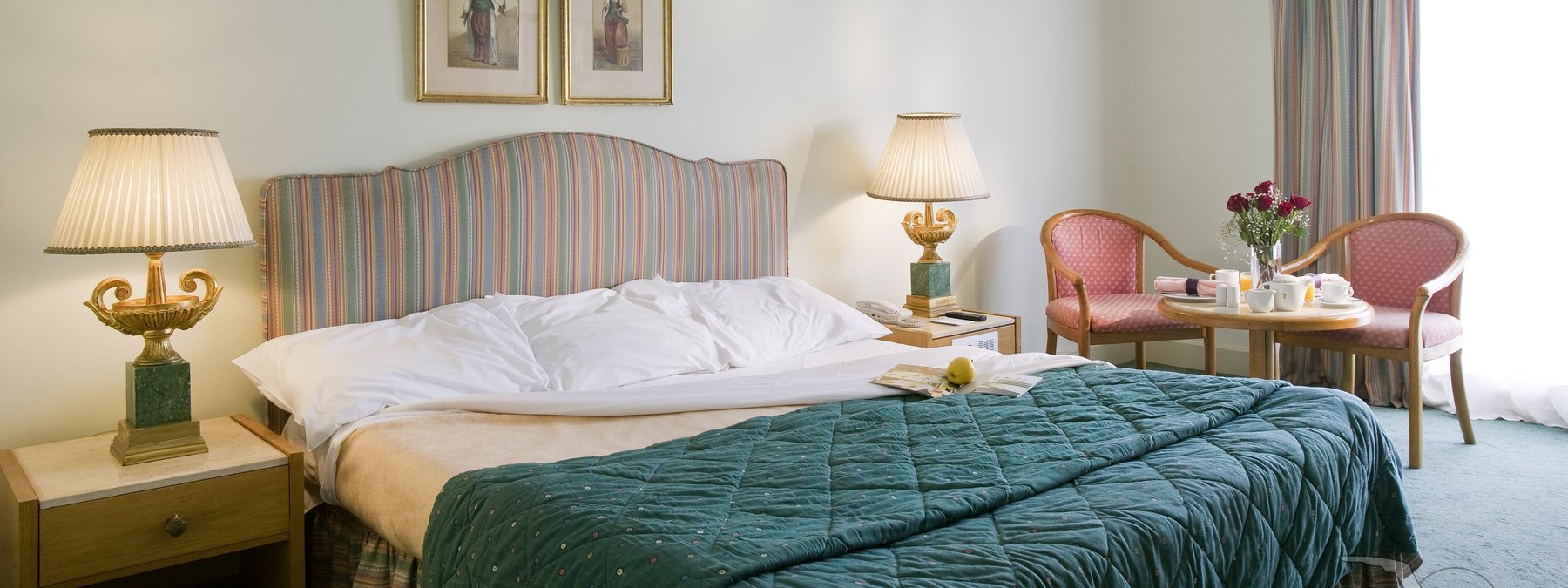 Doppelzimmer Classic Gartenblick (DZG) mit Klimaanlage, Bad/WC, Föhn, Telefon, SAT-TV, Safe, Minibar und Balkon.