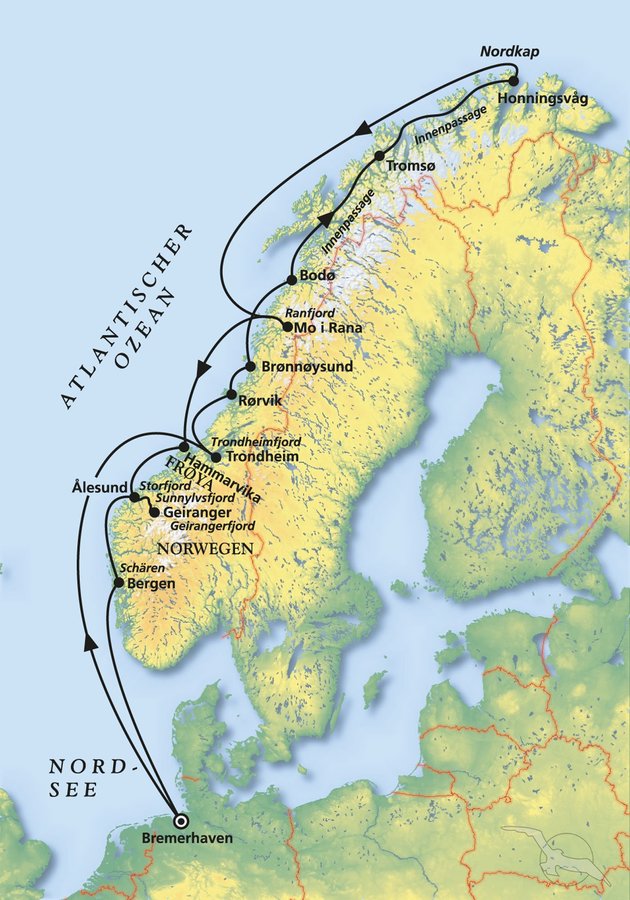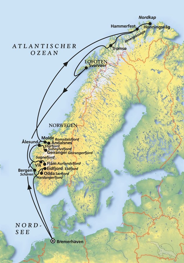 Unglaublich abwechslungsreich und faszinierend schön sind die Aussichten, die Sie auf dieser Nordkap Kreuzfahrt erleben. Was die Natur über Jahrmillionen an der norwegischen Westküste geschaffen hat, ist einzigartig. Im äußersten Norden des Landes, wo mit dem Nordkap in der gleichnamigen Gemeinde der Provinz Finnmark, der nördlichste Ort des europäischen Festlandes markiert wird, zeigt sich die Faszination der arktischen Natur. Kein Baum, weil die Baumgrenze längst überschritten ist, dafür Moose, Felslandschaften mit Bächen und Wasserfällen und rundherum das polare Eismeer bieten eine dramatisch schöne Stimmung.