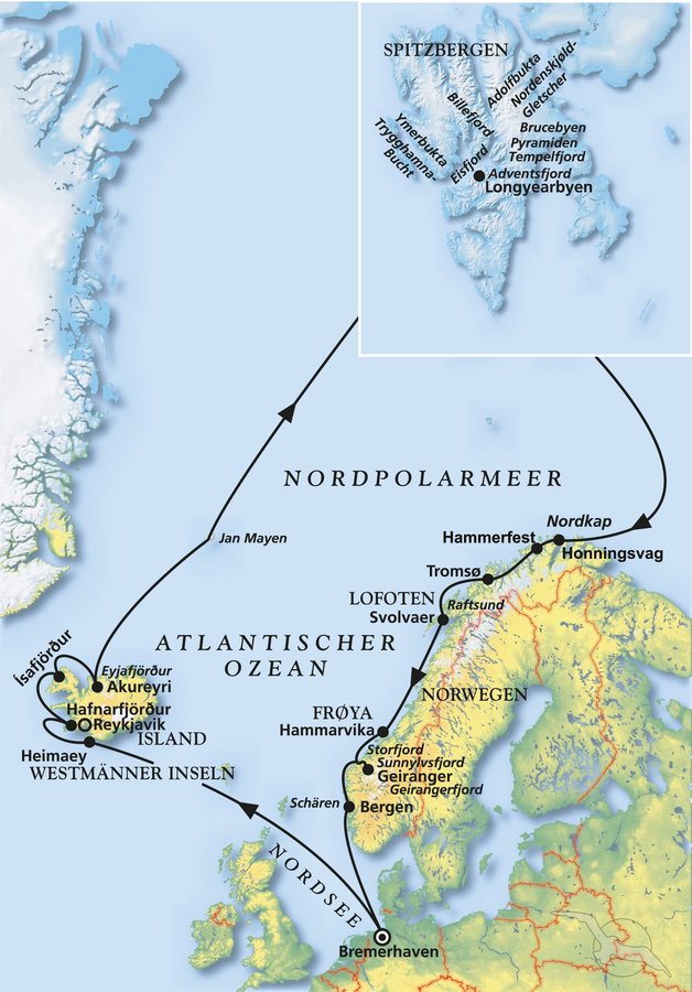 In der Sonne glänzende Gletschergiganten, nordische Kulturen und ein Reichtum an Flora, Fauna und Polarcharme: Eine Kreuzfahrt auf dem Nordpolarmeer lohnt sich in jedem Fall. Fotografieren Sie sich am Nordkap mit dem weltbekannten Globus, der symbolisch für den nördlichsten Punkt des europäischen Festlands steht. In Longyearbyen, dem nördlichsten noch dauerhaft bewohnten Ort der Welt, befindlich im Archipel Spitzbergen, haben Sie die Möglichkeit, mehr über die norwegische Kultur zu erfahren und idyllischen Inselcharme mitzuerleben. Bekannt für seine Fjorde: Norwegens ganzes Panorama mit tiefblauen Fjorden, grünen Wäldern und imposanten Berggebieten wird Sie definitiv verzaubern.