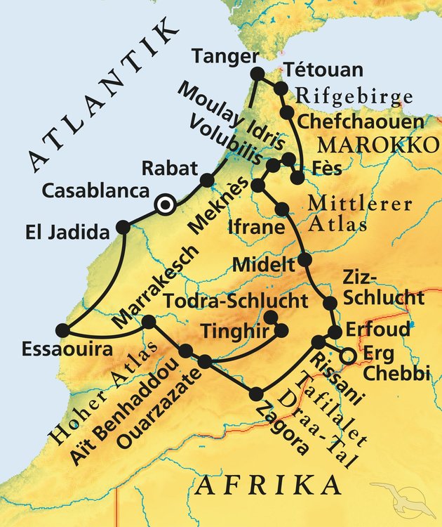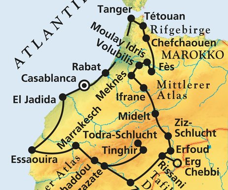 Unsere Marokko Rundreise, die Sie von der Mittelmeerküste an der Straße von Gibraltar bis zur großen Sandmeerwüste des Erg Chebbi in den Süden des Landes führt. Ausgangs- und Endpunkt der zusammengestellten Rundreise durch Marokko ist die Wirtschafts- und Finanzmetropole Casablanca. Entlang der Atlantikküste geht es zunächst in den grünen Norden zur Hafenstadt Tanger am Mittelmeer und weiter durch das Rifgebirge zu den sehenswerten Städtchen Tetouan und Chefchaouen. Selbstverständlich sind die vier historischen Königsstädte ebenso Bestandteil des Besuchsprogramms wie eine traumhafte Route durch den malerischen Süden über die Straße der Kasbahs bis zur „Perle des Südens“ nach Marrakesch.