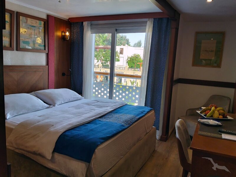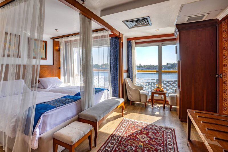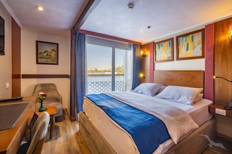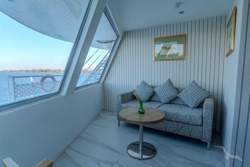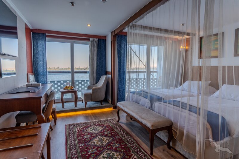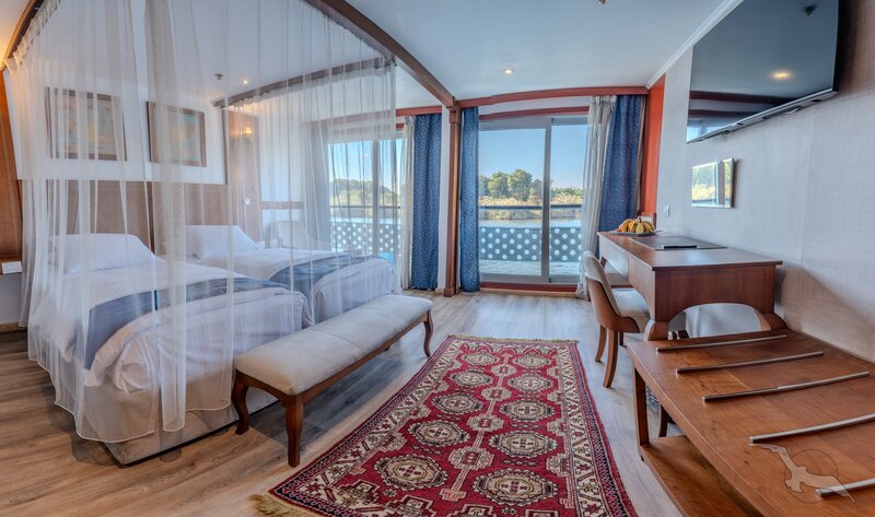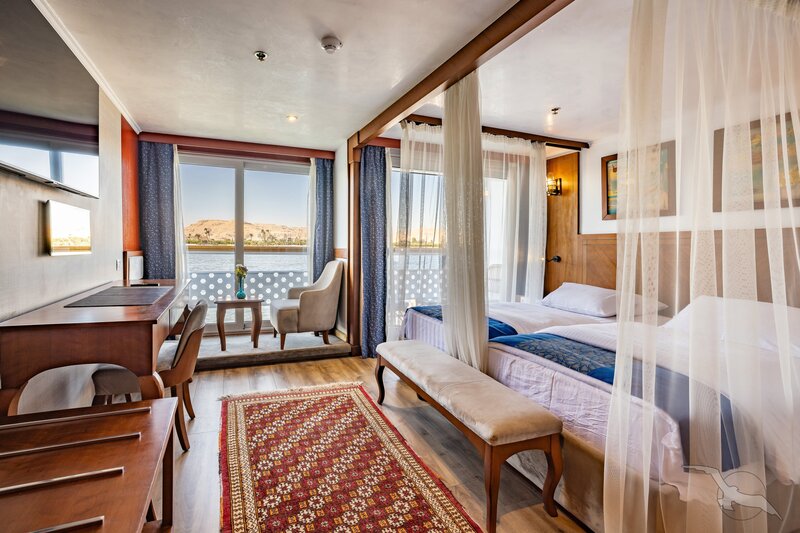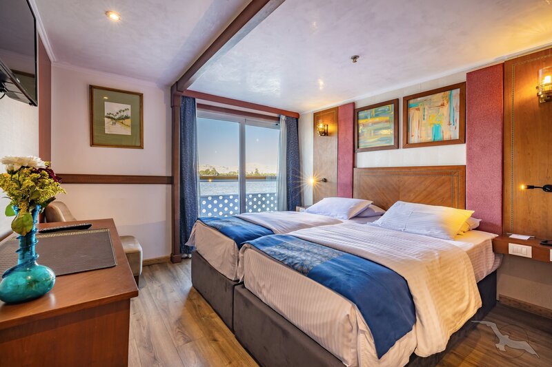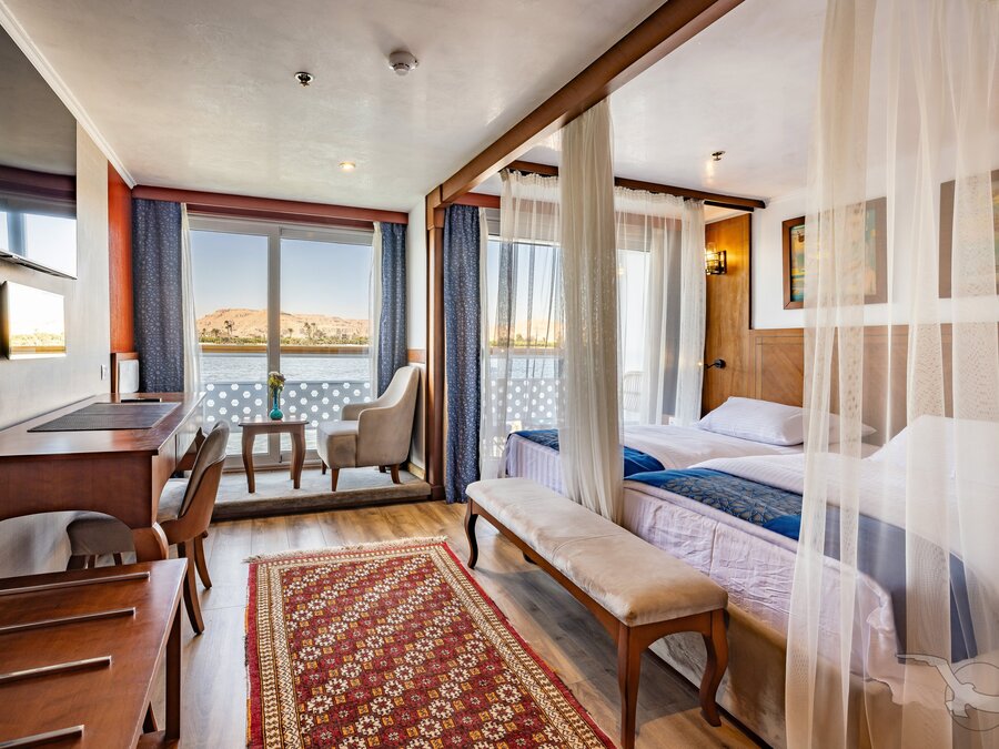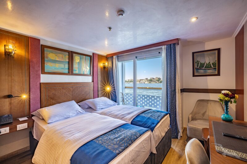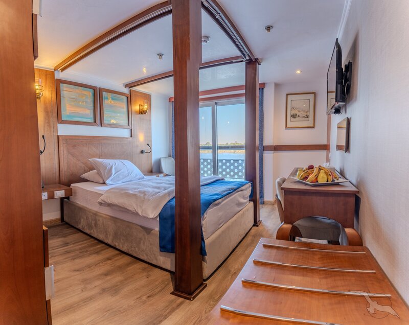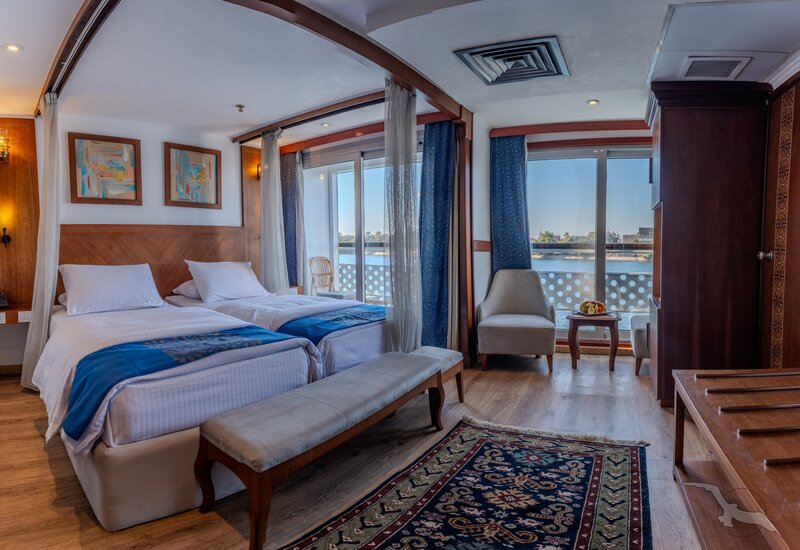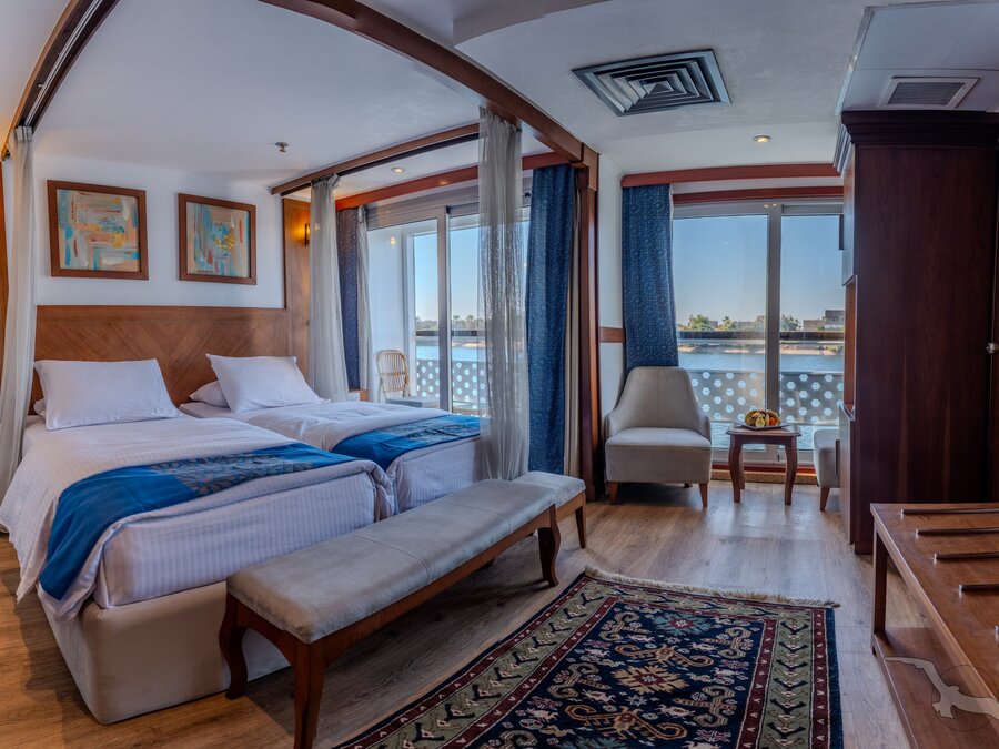 Das Schiff hat 49 großzügig gestaltete und erstklassig eingerichtete Außenkabinen inklusive einer Suite. Die 2-Bett-Kabinen (ca. 22 m²) mit trennbaren Betten verfügen auf den beiden oberen Decks (Osiris- und Atondeck) über einen kleinen Außenbalkon mit Sitzgelegenheit sowie zusätzlich einen französischen Balkon mit integrierter Sitzecke (2 Sessel und Tisch), SAT-TV mit Doku-/Filmkanal, Schiffstelefon, Privatsafe, Teekocher, gefüllte Minibar (nicht alkoholische Getränke bei Reise Anubis), Dusche/WC, Föhn, regulierbare Klimaanlage, 220 Volt Wechselstrom, Kabinenservice.