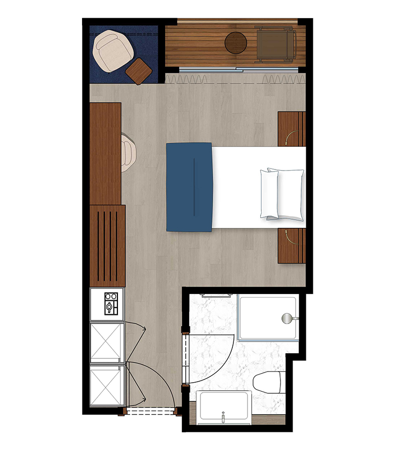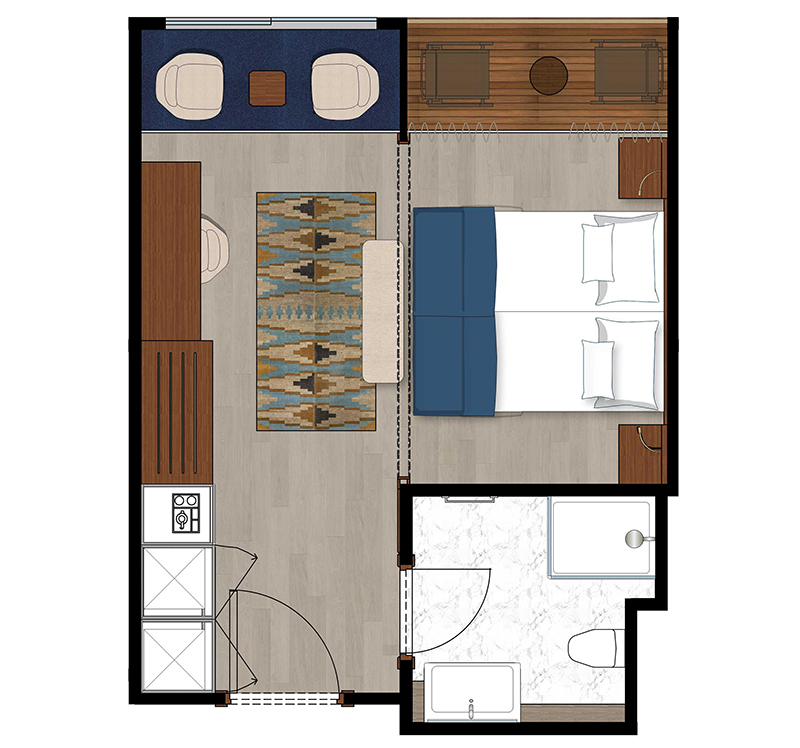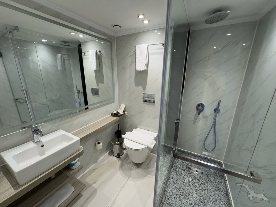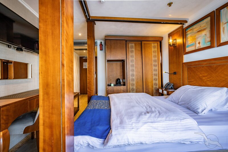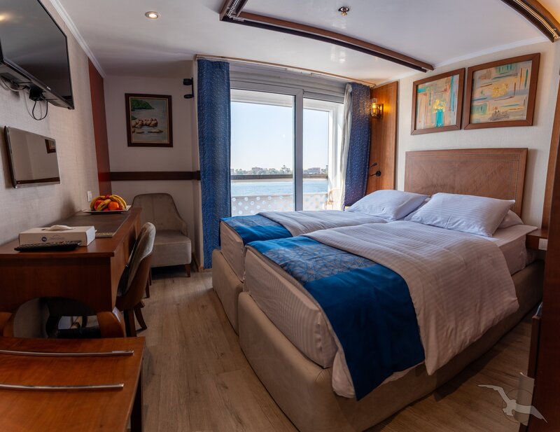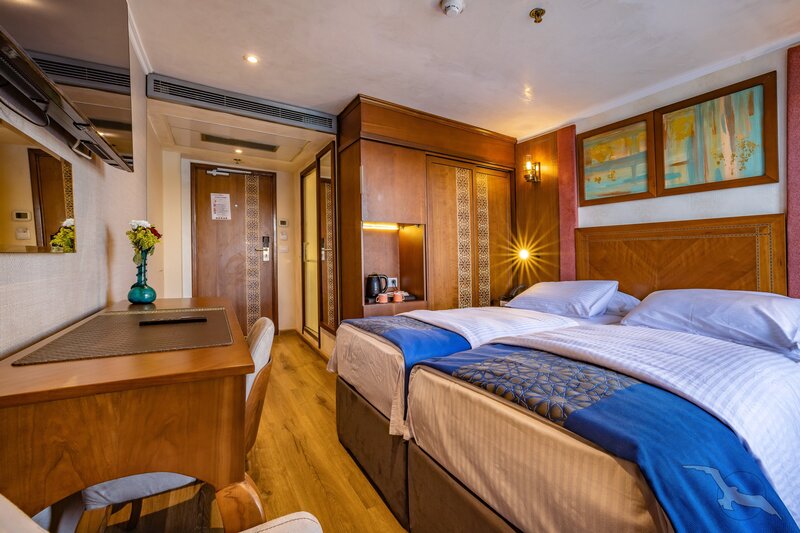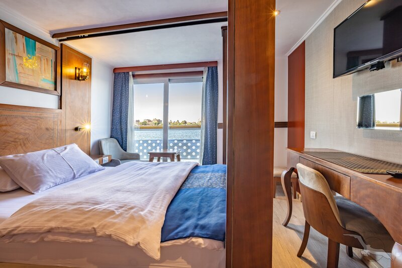 Alle Außenkabinen sind modern und erstklassig eingerichtet mit landestypischen Stilelementen und verfügen über zwei französische Balkone. Ausstattung: Sitzgelegenheit mit zwei Sesseln und Tisch, trennbare Betten, Dusche/WC, Föhn, regulierbare Klimaanlage, SAT-TV mit Musik-, Doku- und Filmkanal, Schiffstelefon, Privatsafe, Kabinenservice, Minibar mit Softdrinks, Teekocher, 220 Volt Wechselstrom/Eurostecker.