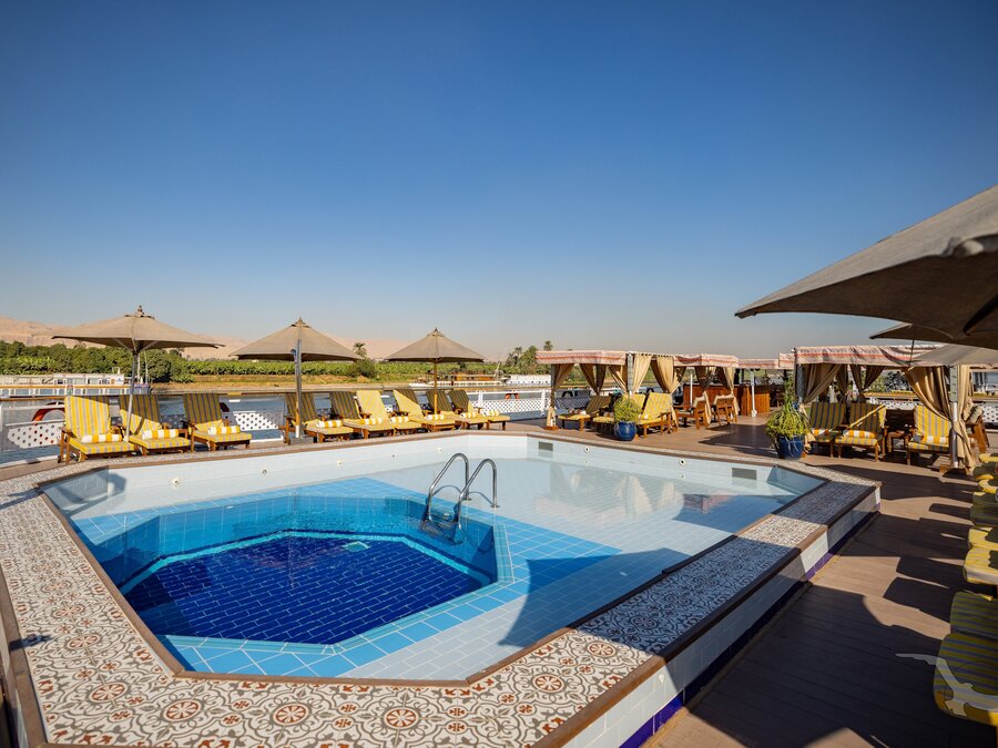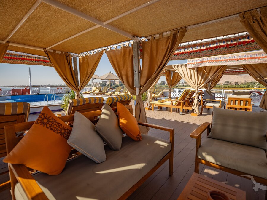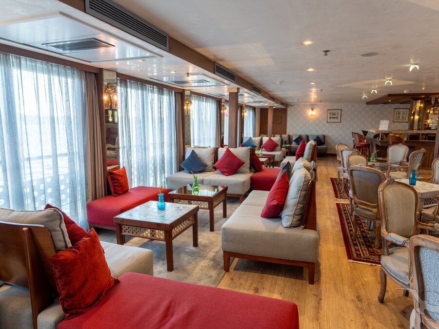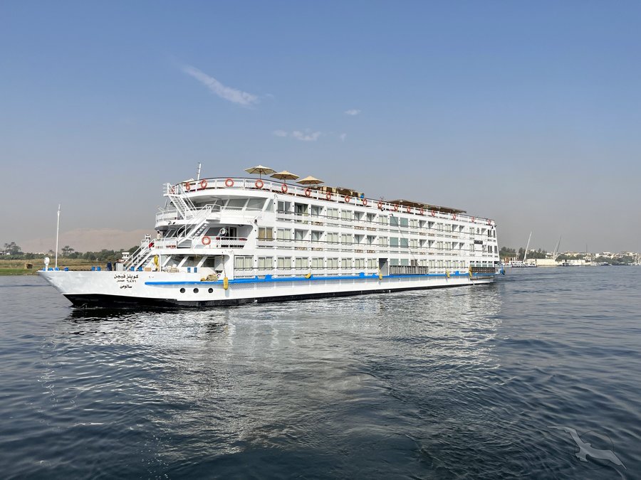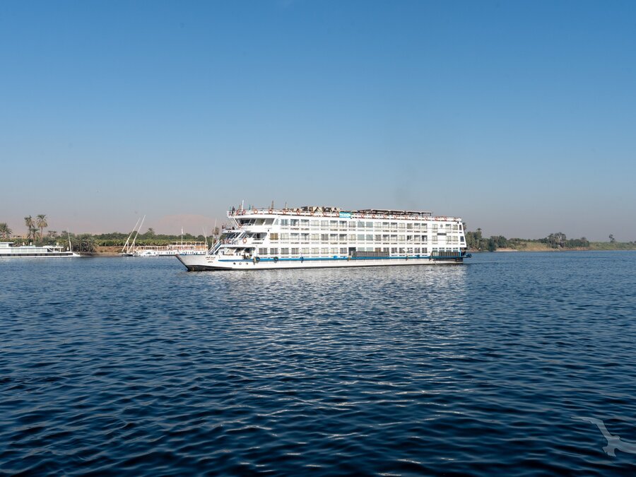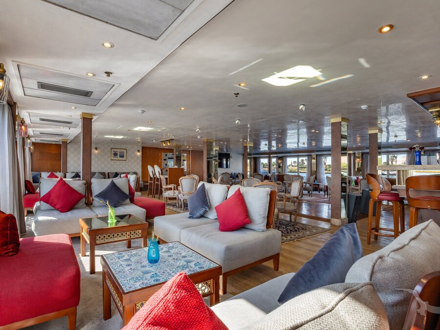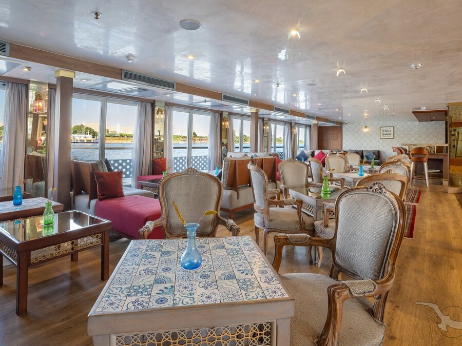 Das 2023 komplett neu gestaltete Nilkreuzfahrtschiff ist auf allen fünf Passagierdecks baulich verändert und überholt worden. In neuem Design verfügt es über großzügig konzipierte öffentliche Bereiche wie Rezeption mit Eingangshalle, Lounge/Bar/Salon, Restaurant (gemeinsame Tischzeit) und ein Sonnendeck mit Swimmingpool sowie Café-Bar/Terrasse. Alle Einrichtungen des Schiffs sind geschmackvoll, modern und hochwertig mit orientalischen Stilelementen landestypisch ausgestattet. Das vollklimatisierte First-Class-Schiff (Landeskategorie 5 Sterne deluxe) verfügt über einen Aufzug, Sauna, Fitnessecke, Massagebereich, Boutique/Shop. Auf dem Sonnendeck befindet sich das Außencafé mit Terrasse, auf dem ausreichend Schattenplätze unter Sonnensegeln und Sonnenliegen/-schirme vorhanden sind. BBQ/Grillstation, WLAN in der Lounge kostenfrei (eingeschränkter Empfang). Unsere Deutsch sprechende Reisleitung sowie die gut ausgebildeten, lizensierten Reiseführer begleiten Sie während der gesamten Reise zu den Höhepunkten Ihrer Kreuzfahrt und stehen Ihnen jederzeit zur Verfügung. Die aufmerksame Schiffscrew verwöhnt Sie an Bord bis zur Ausschiffung. Bordwährung ist das Ägyptische Pfund (EURO wird akzeptiert).