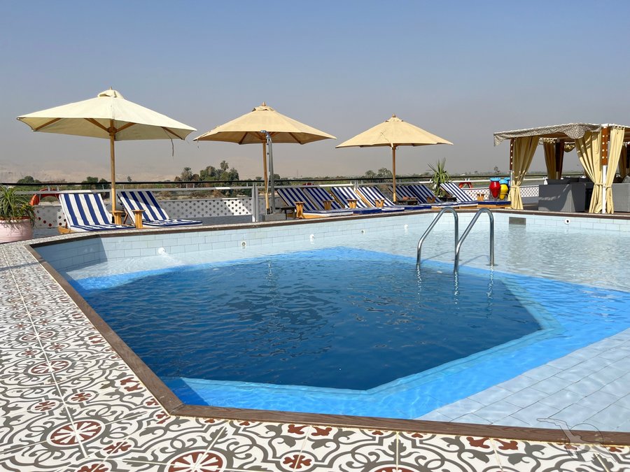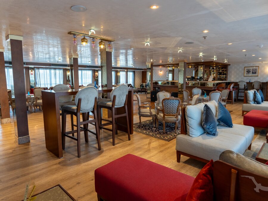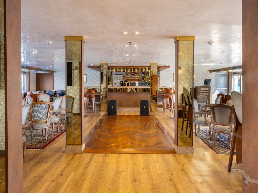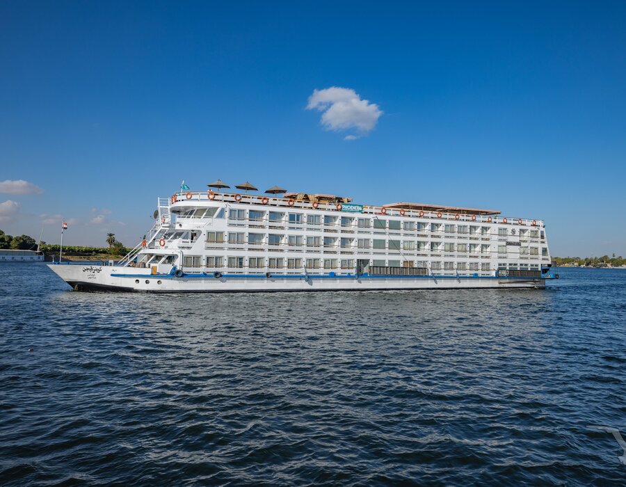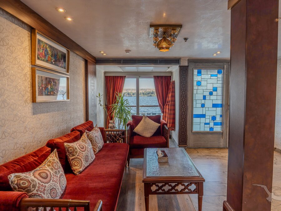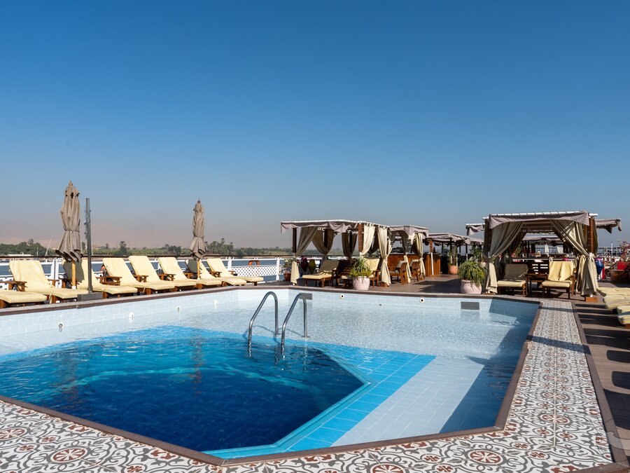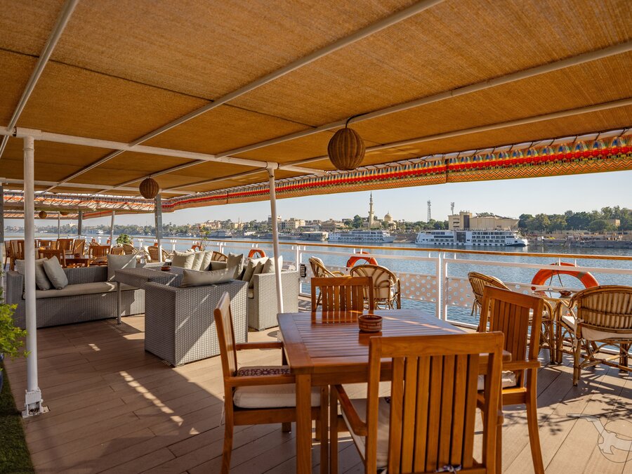 Das 2023 komplett neu gestaltete Nilkreuzfahrtschiff ist auf allen fünf Passagierdecks baulich verändert und überholt worden. In neuem Design verfügt es über großzügig konzipierte öffentliche Bereiche wie Rezeption mit Eingangshalle, Lounge/Bar/Salon, Restaurant (gemeinsame Tischzeit) und ein Sonnendeck mit Swimmingpool sowie Café-Bar/Terrasse. Alle Einrichtungen des Schiffs sind geschmackvoll, modern und hochwertig mit orientalischen Stilelementen landestypisch ausgestattet. Das vollklimatisierte First-Class-Schiff (Landeskategorie 5 Sterne deluxe) verfügt über einen Aufzug, Sauna, Fitnessecke, Massagebereich, Boutique/Shop. Auf dem Sonnendeck befindet sich das Außencafé mit Terrasse, auf dem ausreichend Schattenplätze unter Sonnensegeln und Sonnenliegen/-schirme vorhanden sind. BBQ/Grillstation, WLAN in der Lounge kostenfrei (eingeschränkter Empfang). Unsere Deutsch sprechende Reisleitung sowie die gut ausgebildeten, lizensierten Reiseführer begleiten Sie während der gesamten Reise zu den Höhepunkten Ihrer Kreuzfahrt und stehen Ihnen jederzeit zur Verfügung. Die aufmerksame Schiffscrew verwöhnt Sie an Bord bis zur Ausschiffung. Bordwährung ist das Ägyptische Pfund (EURO wird akzeptiert).