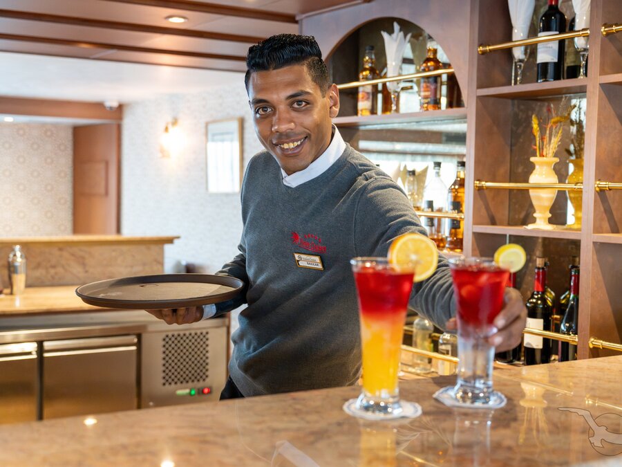 - All inclusive light mit reichhaltigem Frühstück, Mittag- und Abendbuffet, nachmittags Tee/Kaffee und Gebäck, Heißgetränke und Softdrinks wie Café, Cappuccino, Wasser, Cola, Sprite und Säfte während der gesamten Kreuzfahrt sowie lokaler Wein und lokales Bier während Mittag- und Abendessen inklusive