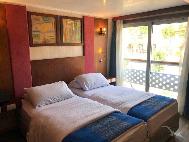 Alle Außenkabinen sind modern und erstklassig eingerichtet mit landestypischen Stilelementen und verfügen über einen französischen Balkon. Ausstattung: Sitzgelegenheit mit Sessel und Tisch, trennbare Betten (0,80 x 2 m), Dusche/WC, Föhn, regulierbare Klimaanlage, SAT-TV mit Musik-, Doku- und Filmkanal, Schiffstelefon, Privatsafe, Kabinenservice, Minibar mit Softdrinks etc., Teekocher, 220 Volt Wechselstrom/Eurostecker.