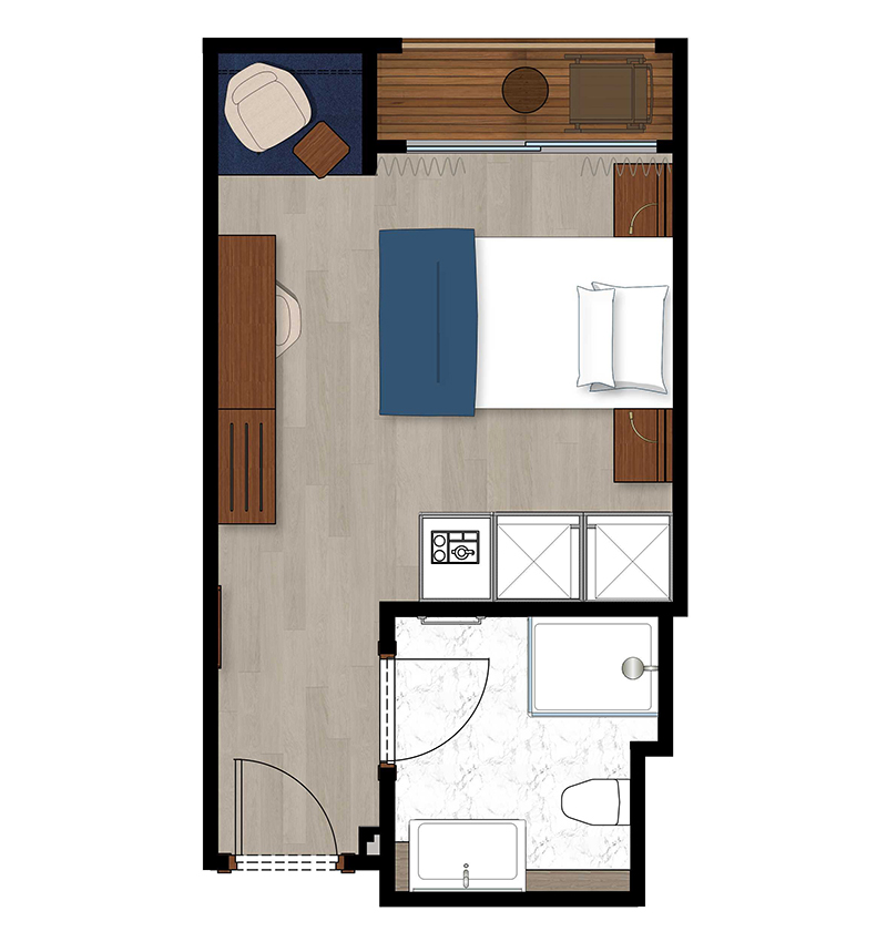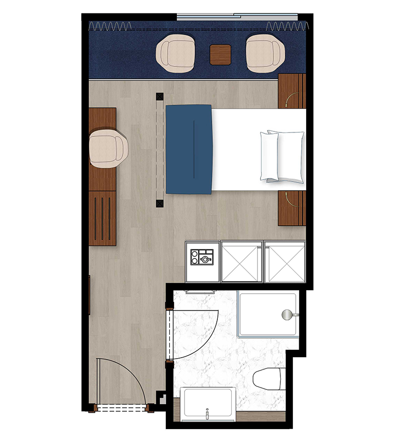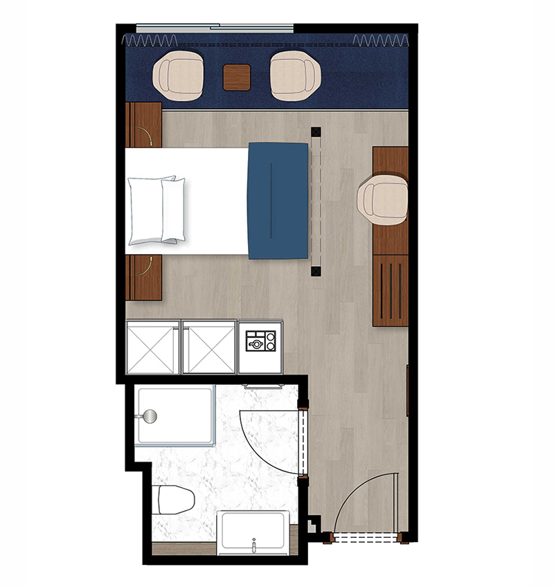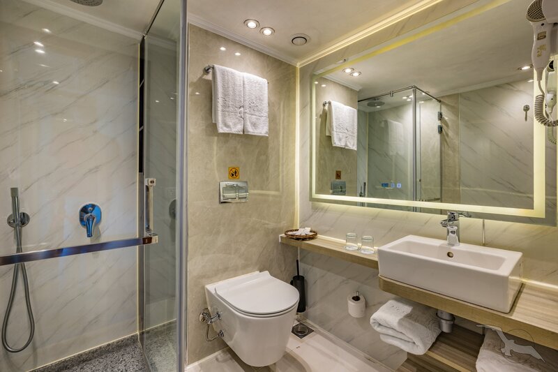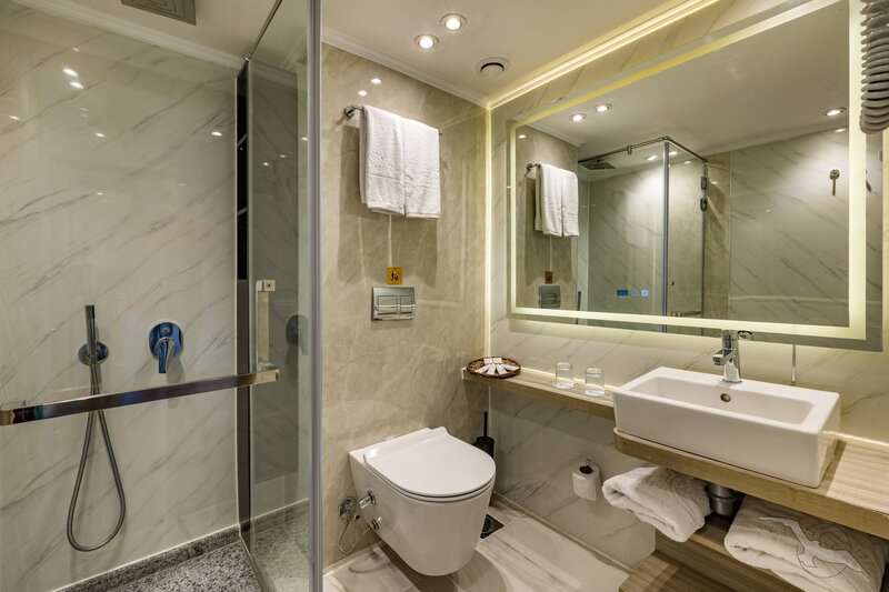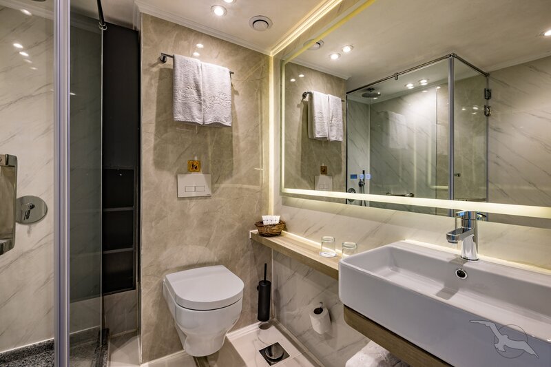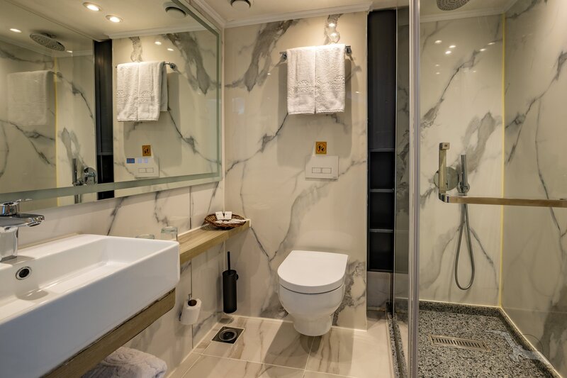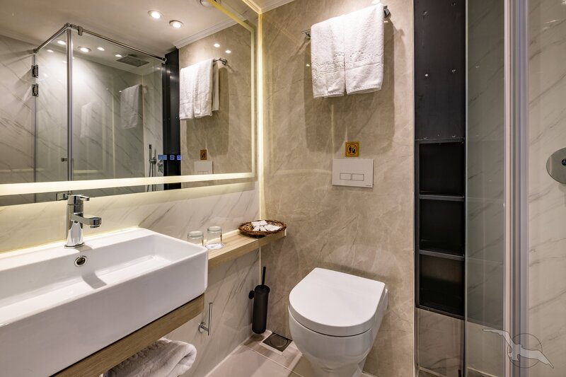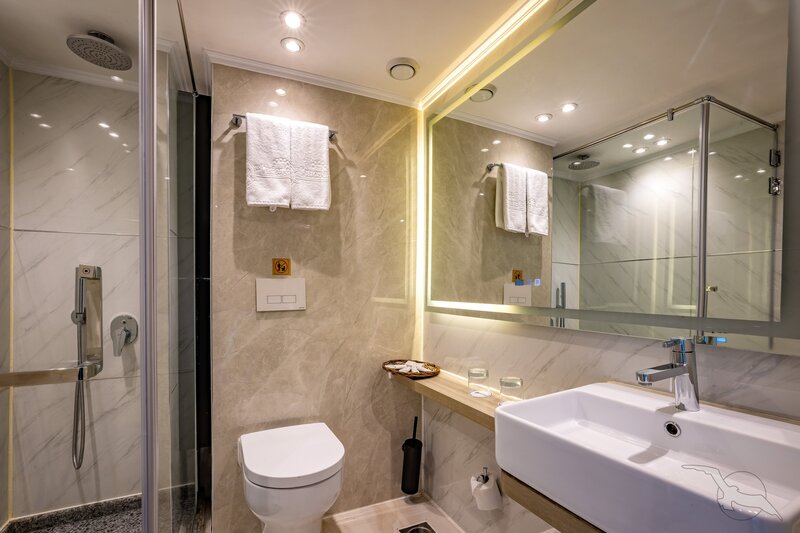 Alle Außenkabinen sind modern und erstklassig eingerichtet mit landestypischen Stilelementen und verfügen über einen französischen Balkon. Ausstattung: Sitzgelegenheit mit Sessel und Tisch, französisches Bett (1,20 x 2 m), Dusche/WC, Föhn, regulierbare Klimaanlage, SAT-TV mit Musik-, Doku- und Filmkanal, Schiffstelefon, Privatsafe, Kabinenservice, Minibar mit Softdrinks etc., Teekocher, 220 Volt Wechselstrom/Eurostecker.