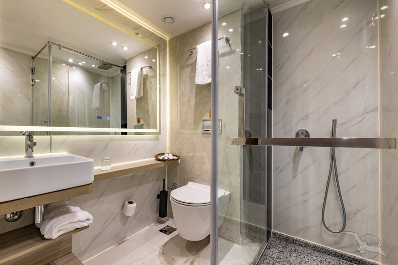 Alle Außenkabinen sind modern und erstklassig eingerichtet mit landestypischen Stilelementen und verfügen über einen Balkon. Ausstattung: Sitzgelegenheit mit Sessel und Tisch, trennbare Betten (0,80 x 2m), Dusche/WC, Föhn, regulierbare Klimaanlage, SAT-TV mit Musik-, Doku- und Filmkanal, Schiffstelefon, Privatsafe, Kabinenservice, Minibar mit Softdrinks etc., Teekocher, 220 Volt Wechselstrom/Eurostecker.