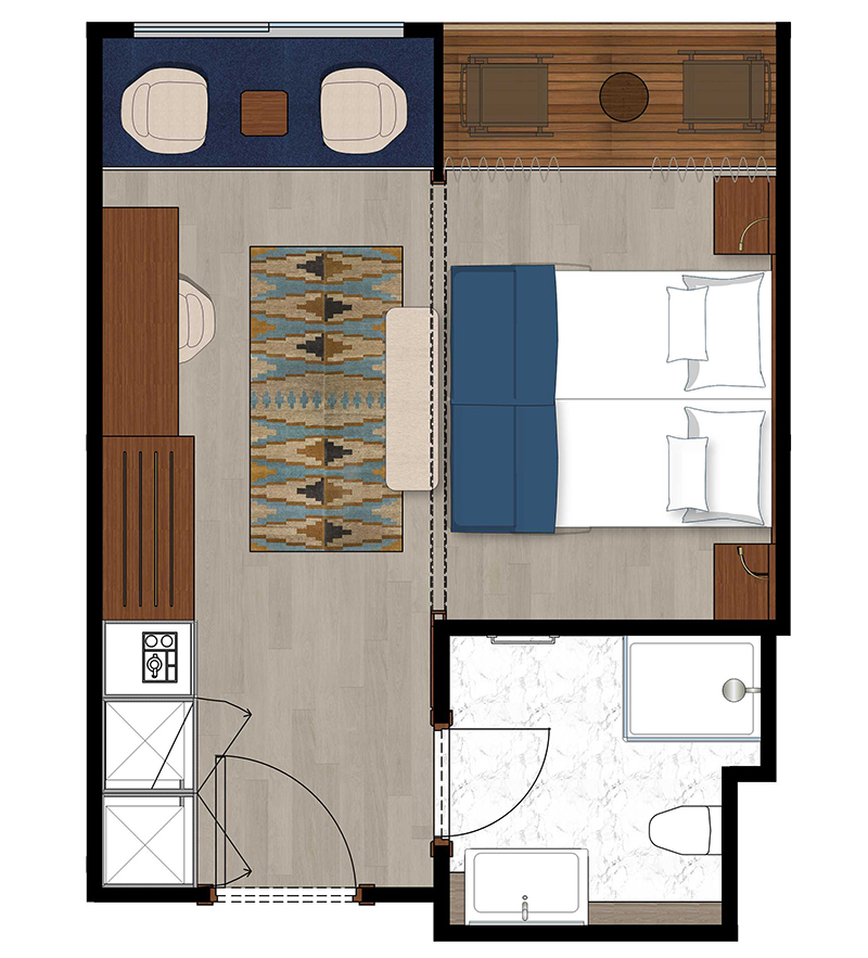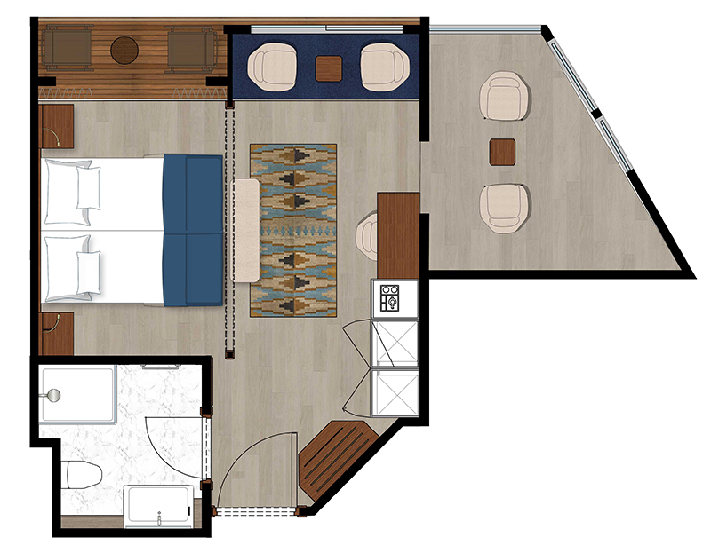 Alle Außenkabinen sind modern und erstklassig eingerichtet mit landestypischen Stilelementen und verfügen über einen Balkon. Ausstattung: Sitzgelegenheit mit Sessel und Tisch, Queensizebett (1,60 x 2 m), Dusche/WC, Föhn, regulierbare Klimaanlage, SAT-TV mit Musik-, Doku- und Filmkanal, Schiffstelefon, Privatsafe, Kabinenservice, Minibar mit Softdrinks etc., Teekocher, 220 Volt Wechselstrom/Eurostecker.