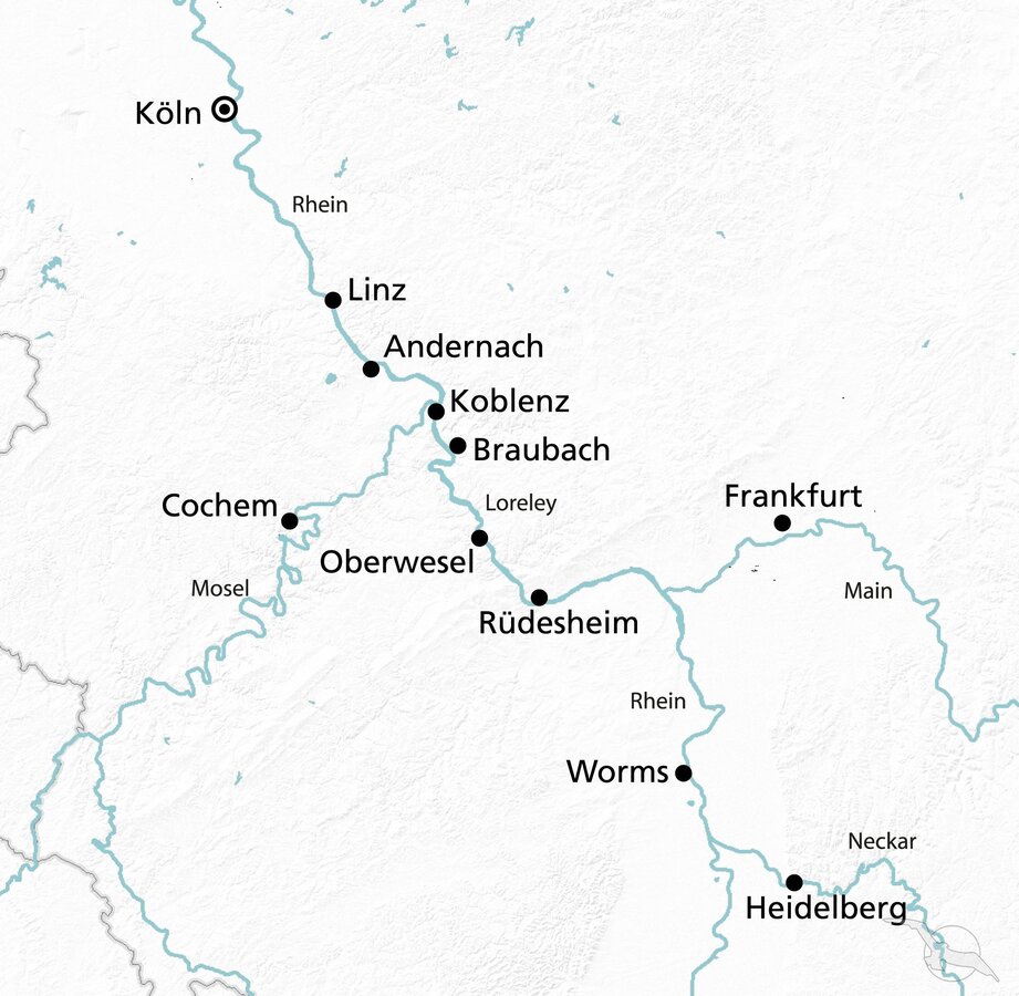 Köln - Andernach - Cochem - Koblenz - Braubach - Loreley - Frankfurt - Heidelberg - Rüdesheim - Oberwesel - Köln