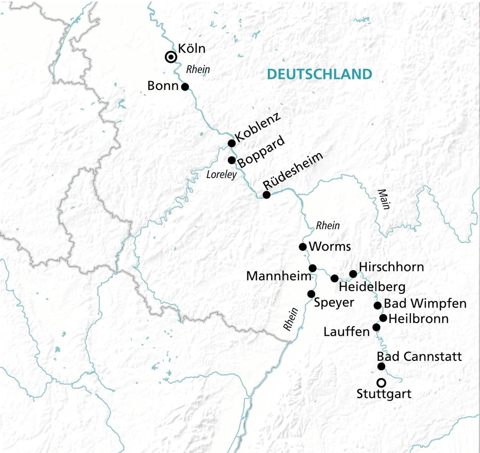 Verträumte Flusslandschaften und prachtvolle Weinberge, malerische Schlösser und pittoreske Burgen säumen Ihren Weg auf Rhein und Neckar. Das Mittelrheintal gilt mit seinen wild zerklüfteten Flussufern, den 40 Burgen, Ruinen und Kastellen als einzigartiges kulturlandschaftliches Gesamtkunstwerk. Kurz bevor Sie den Neckardurchbruch im Odenwald befahren, besuchen Sie Heidelberg mit seinem harmonischen Ensemble aus Schloss, Altstadt und Fluss. Heilbronn ist Ihr nächster Gastgeber, bevor Sie Stuttgart erreichen. Wieder flussabwärts rasten Sie im malerischen Bad Wimpfen. Über Hirschhorn und Mannheim steuert Ihr Schiff die Nibelungen- und Lutherstadt Worms an. Abermals kreuzen Sie gemütlich auf dem romantischen Rhein mit Stopp in Bonn, bevor Sie nach Köln zurückkehren.
