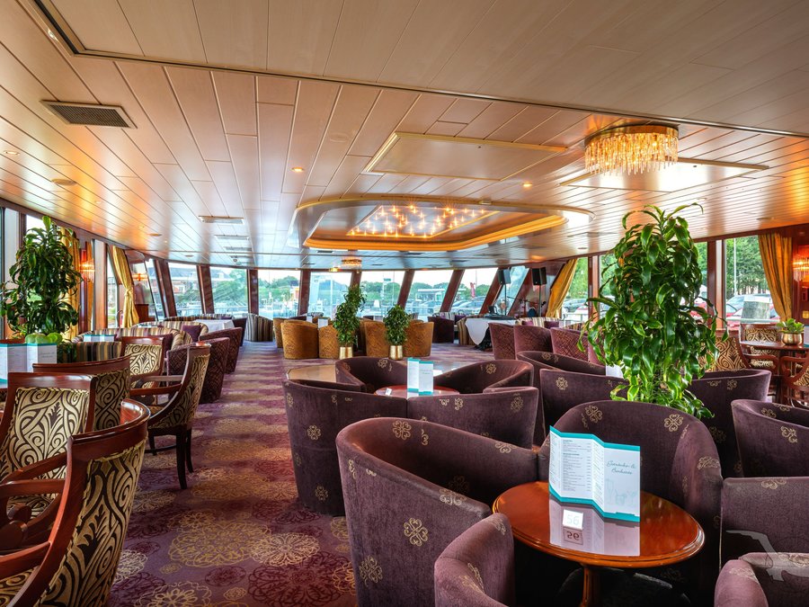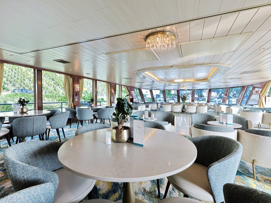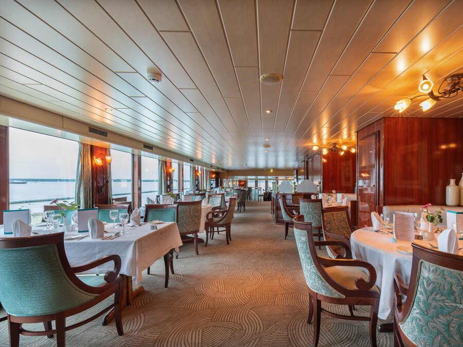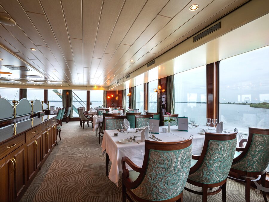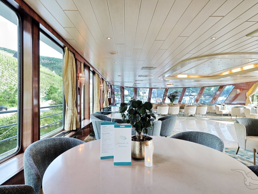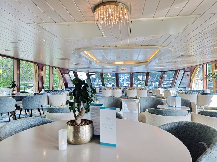 Die Fensterfronten im Restaurant von MS Rhein Prinzessin sorgen für tolle Ausblicke auch während der Mahlzeiten Ein aufmerksames Restaurant- und Küchenteam kümmert sich à la carte (Mittag- und Abendessen) oder in Buffetform (Frühstück) um Ihr kulinarisches Wohlergehen. Die Mahlzeiten werden in einer gemeinsamen Tischzeit an fest reservierten Plätzen seviert.