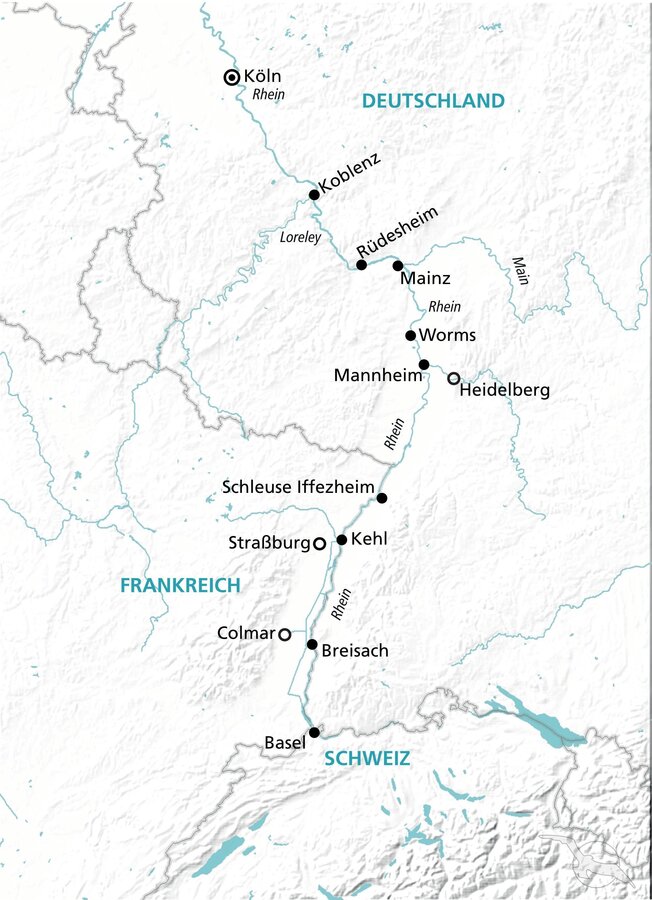 Diese Rheinflussfahrt auf dem größten Fluss Deutschlands ist eine Reise wert. Freuen Sie sich darauf an Bord verwöhnt zu werden und interessante Landschaften zu genießen. Probieren Sie den Rheingauer Riesling bei einem Dämmerschoppen in der Rüdesheimer Drosselgasse. Heidelberg am Neckar mit seinem berühmten Schloss wartet nur darauf auf einem Ausflug von Ihnen entdeckt zu werden. Das Münster in Straßburg zeigt architektonische Meisterleistungen aus vergangenen Jahrhunderten. Der Aufenthalt kann nicht lang genug sein, bevor Sie durch den Breisgau nach Basel gelangen. Die ”Fasnacht“ dort ist über die Landesgrenzen hinaus bekannt. Aber die Stadt hat einiges mehr zu bieten. Ein Ausflug nach Colmar ist ein Muss sowie Spaziergänge durch die aus Römerzeiten besiedelte Stadt Worms. Die Landeshauptstadt Mainz rundet Ihre Reise zu den Schätzen des Rheins ab.